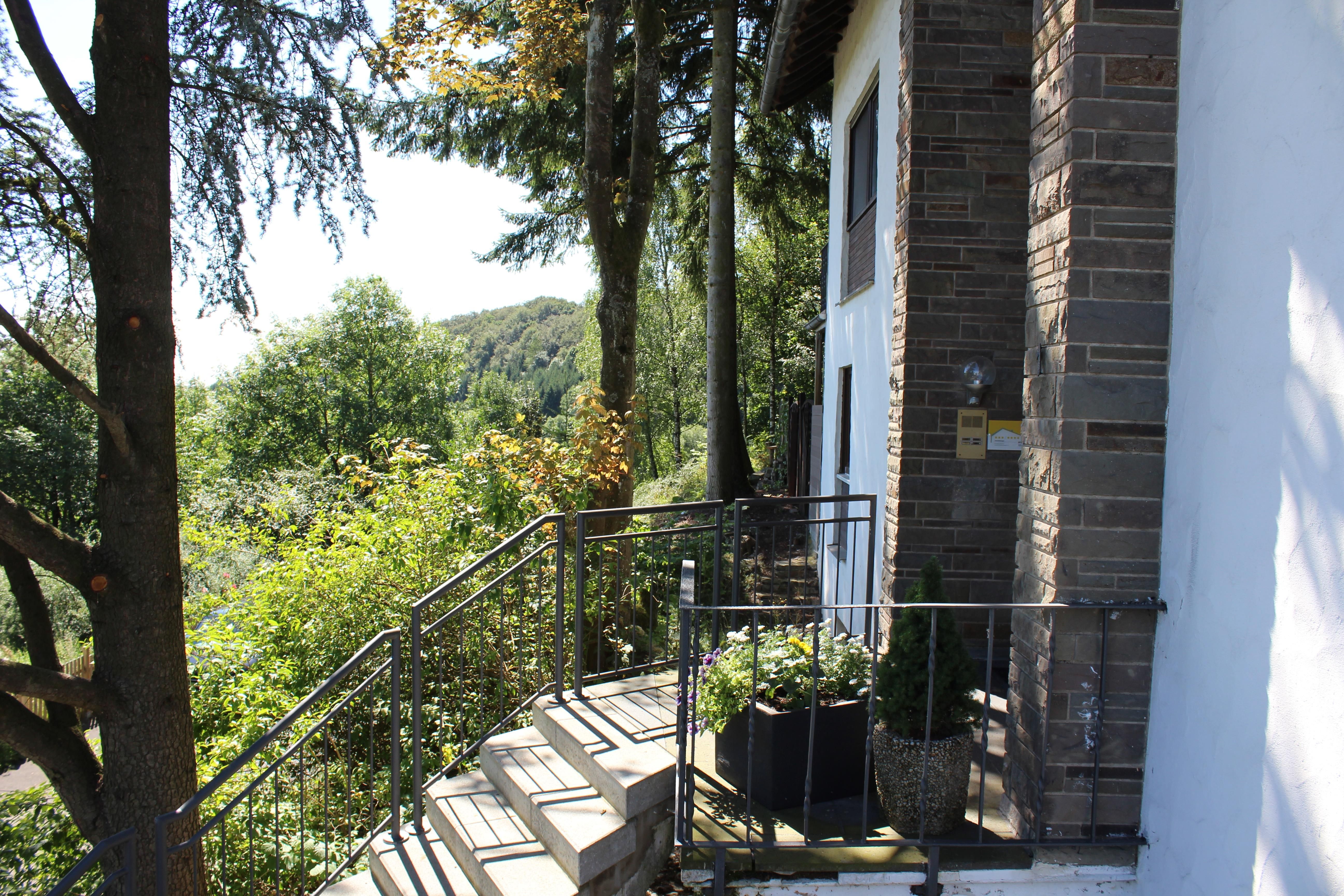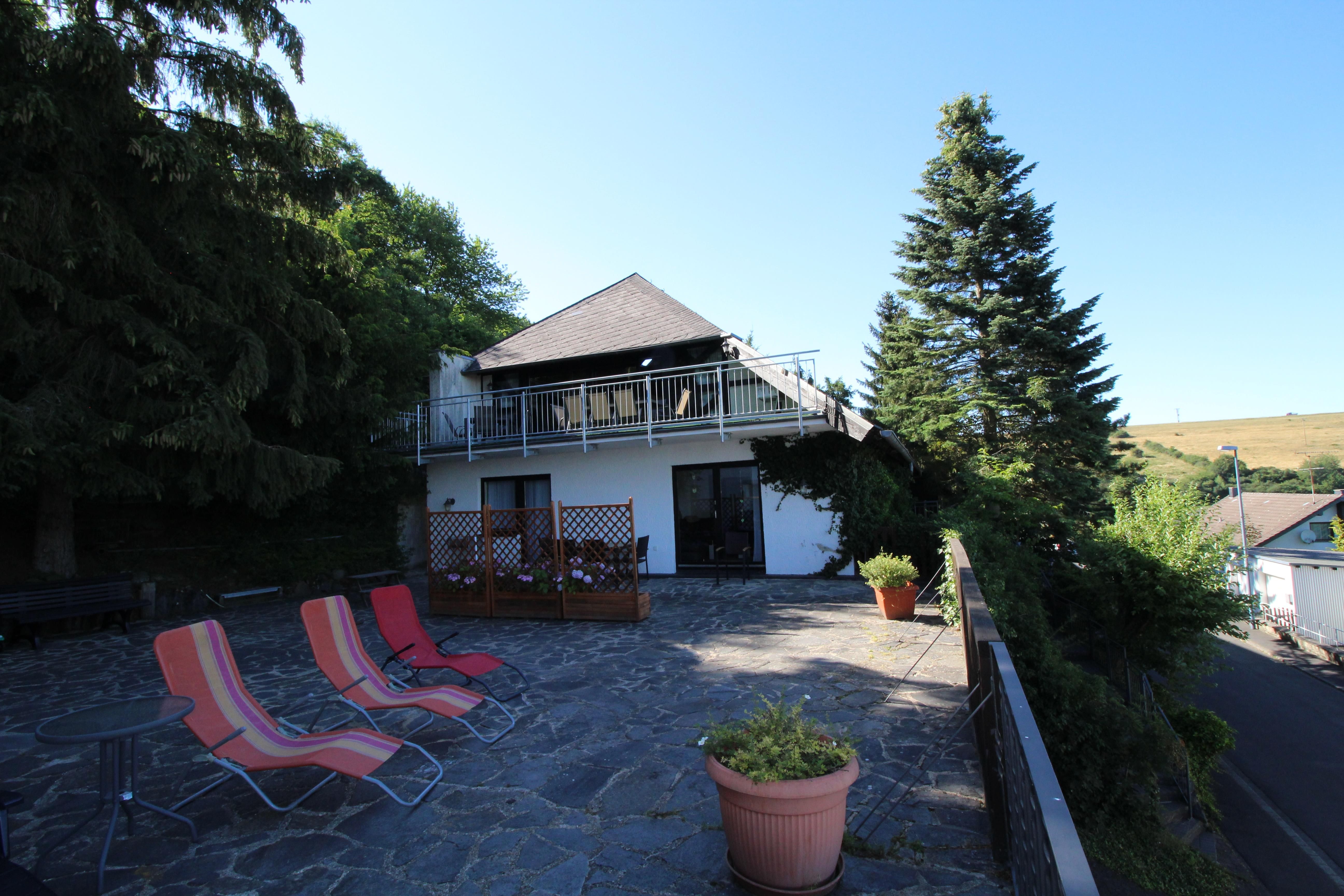 The holiday house, EifelNatur, is found in the idyllic town of Immerath, in Germany's "Vulkaneifel" region. Two maar lakes, the “Immerather Maar” and the “Pulvermaar” are close to the town. The house lies on the edge of town, surrounded by green meadows and trees. The spacious yard around the house, with its large trees and outdoor seating areas offers the ideal atmosphere for quiet relaxation. The house lies on a cul-de-sac road, with no through traffic, making it the perfect vacation home for families with children, who will enjoy all the space for playing outdoors. A mountain bike path is in the immediate vicinity and the Maare-Mosel bicycle trail is only approx. 4 km away. In the entire area many paths are available for serious hiking or just taking relaxing walks. The “Vulkaneifel” is reknowned for its beautiful maar lakes. The two closest of these can be easily reached on foot: the "Immerather Maar" is a nature reserve and the "Pulvermaar" offers a bathing area, restaurant, and boat rentals. The town of Immerath offers a Path of the Senses (Parcours der Sinne) and a School museum in what is probably the oldest school house in the “Vulkaneifel” region. Two wildlife parks, the "Wildlife and Amusement Park Daun" and the "Eagle and Wolf Park Kasselburg" are interesting destinations for a day's outing, as is the Nürburgring race track and cities such as Cochem, Trier or Luxemburg. The Moselle River lies only 22 km away. BadBertrich, only 13 km from Immerath, is a thermal spa, which is fed by a hot spring which arises in the area’s volcanic stone. Three of the generously-sized apartments have seven beds each. Each of these apartments has three bedrooms, two baths, a kitchen, entry, and living room. One apartment has 5 beds; it has two bedrooms, a large bath, and also a kitchen, entry, and living room. The entire EifelNatur house can, therefore, also accomodate groups of up to 26 people. Balconies with a southern exposure and the large terrace with its garden chairs and barbeque possibilities invite you to just relax and enjoy yourself. A common terrace behind the house and the spacious yard around the house are the sites of a table tennis table and a children's play area with swings and a slide, a wooden climbing root, and a seating area. If the weather turns cold, a crackling fire in the open fireplace or wood-burning stove in the living/dining room will make things cozy and warm (not in EifelNatur 4). Special features: - Sauna - “Frei Wohnung” (to the door) delivery service for bread rolls, fireplace wood, drinks, etc. - Pets are welcome - Information material about the region available in the house - Free garage for bicycles and motorcycles - Garage for cars (e.g. classic cars) on request