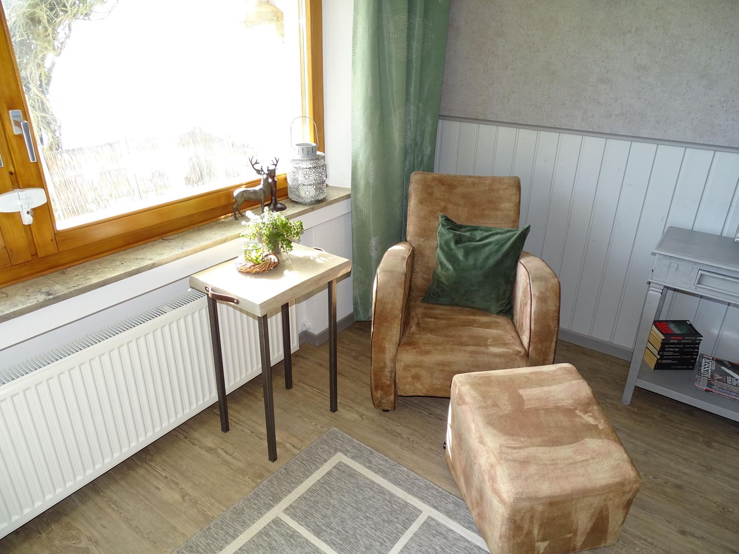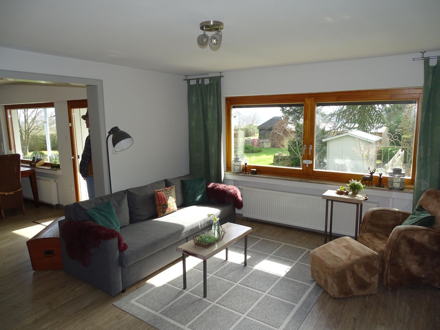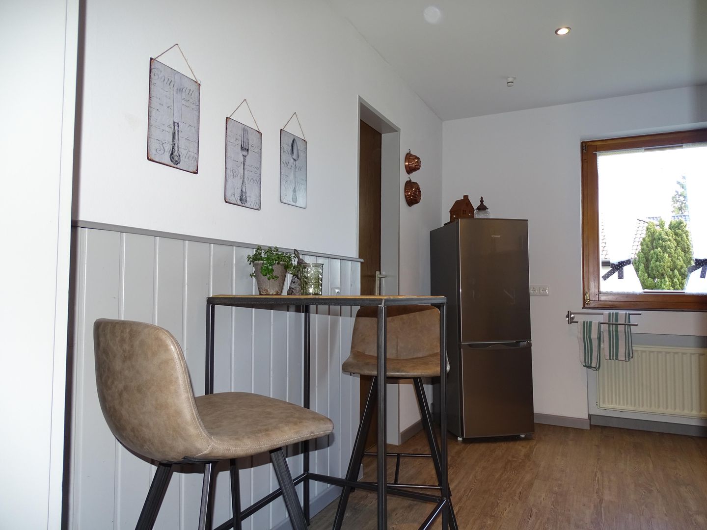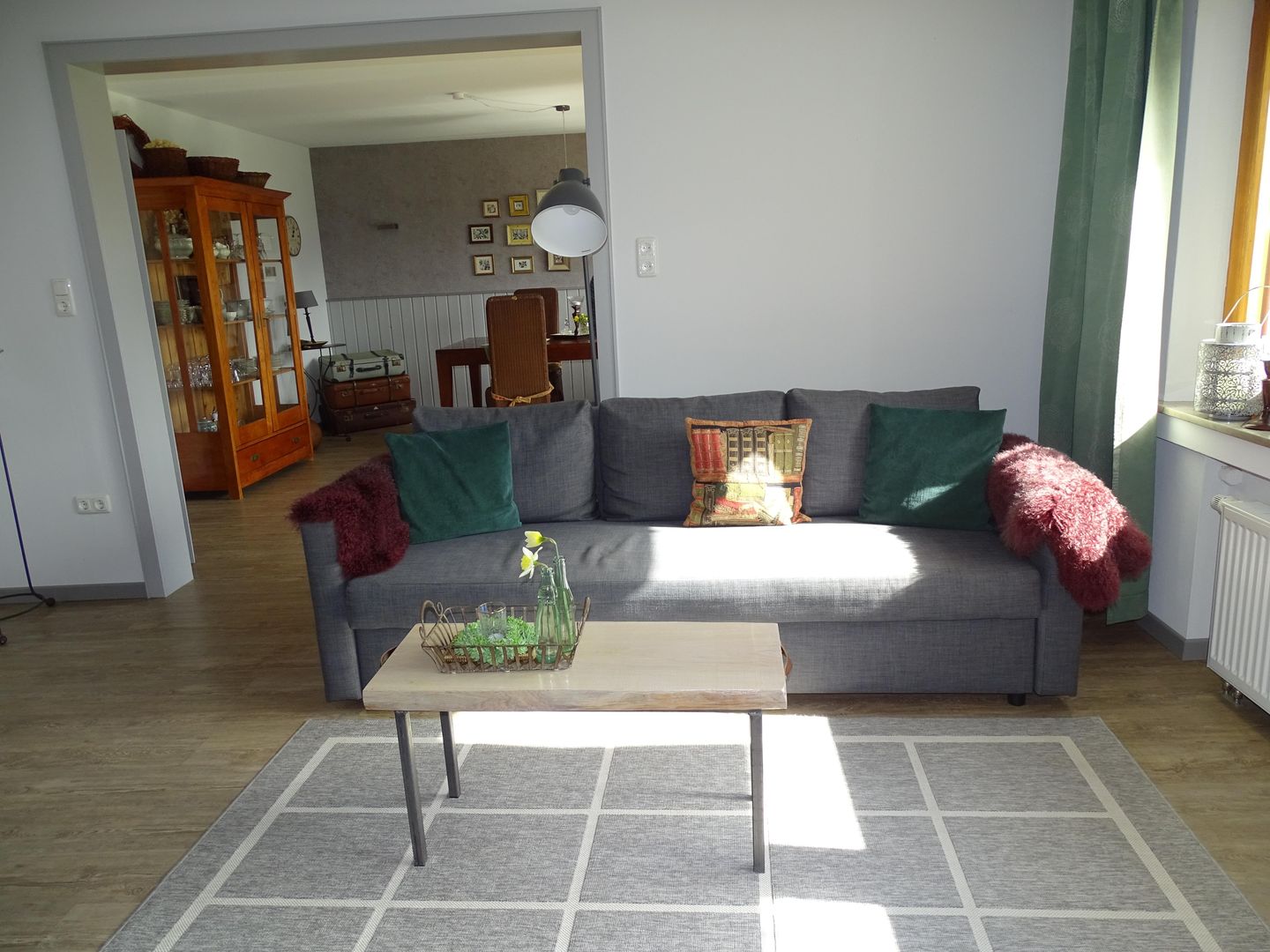 The living and dining room are comfortably and generously furnished and face south with a view of a large garden. There is also a large sofa bed in the living room.