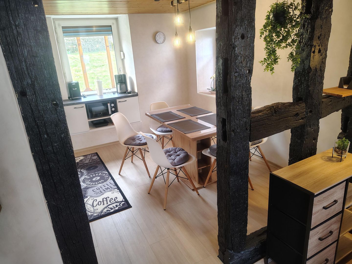 In the idyllic Burgdorf Reifferscheid in the heart of the North Eifel we offer our new modern 60 square meter apartment for up to 4 people. The self-contained apartment on the first floor consists of a large, bright living-dining room with an open, fully equipped kitchen, a separate bedroom, a spacious bathroom and a south-facing terrace. The spacious, open kitchen is fully equipped with dishwasher, washing machine, microwave, oven, toaster and coffee machine. The sitting area in the living room is furnished with a cozy wing chair and a sofa that can be converted into a full-size bed for two adults. There is WiFi, satellite TV and Bluetooth radio. Two steps lead to the separate bedroom with double bed (2m x 2m) and large closet. The modern bathroom is equipped with a walk-in shower, towel dryer and hairdryer. Storage space for bicycles in a locked hall (with electricity) and a car parking space are available free of charge. A small public children's playground is located on the opposite side of the street. Our region is a paradise for hikers and cyclists. Numerous marked hiking trails (including "EifelSchleifen" and "EifelSpuren"), the connection to the premium hiking trail "Eifelsteig", designated (mountain) bike trails (e.g. Eifel-Rad-Schleifen) and the "Vennbahn-Radweg" (between Aachen and St. Vith in Belgium) offer ideal opportunities for hiking and cycling.The popular themed trails "Sonnenglück" and "Auf den Spuren der Raubritter" lead directly past the house. In winter, snow enthusiasts will also get their money's worth at the Weißer Stein (Hellenthal-Udenbreth).