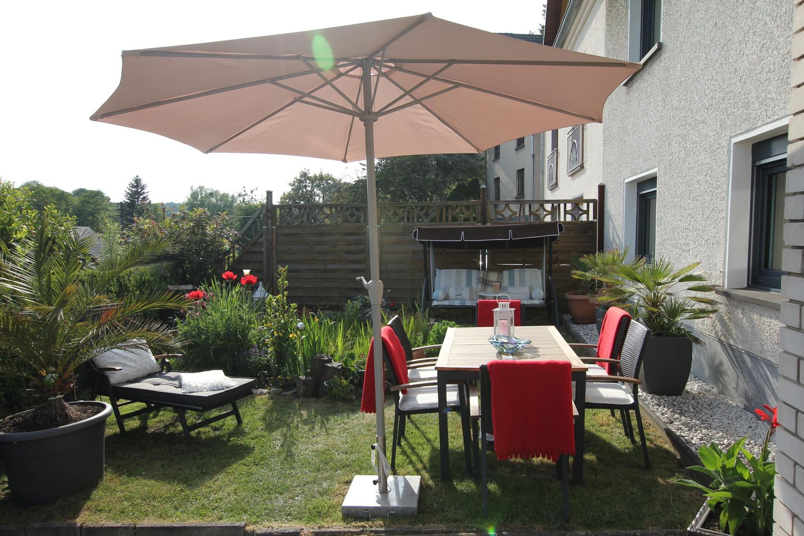 In the sun-drenched Brohltal valley, above the stretch of the Vulkanexpress and with a beautiful view of the hamlet of Weiler von Burgbrohl, our spacious, separately accessible holiday home is situated on a beautiful south-facing slope. High quality and comfortably furnished, it provides our guests with an atmosphere of well-being. Our house is the ideal starting point for discovery tours of all kinds: The geopaths and dream paths of the volcano park stand for first-class hiking experiences. Maria Laach, Laacher See, the nearby Nürburgring, Rhine, Ahr and Mosel offer many other popular and culturally challenging destinations.