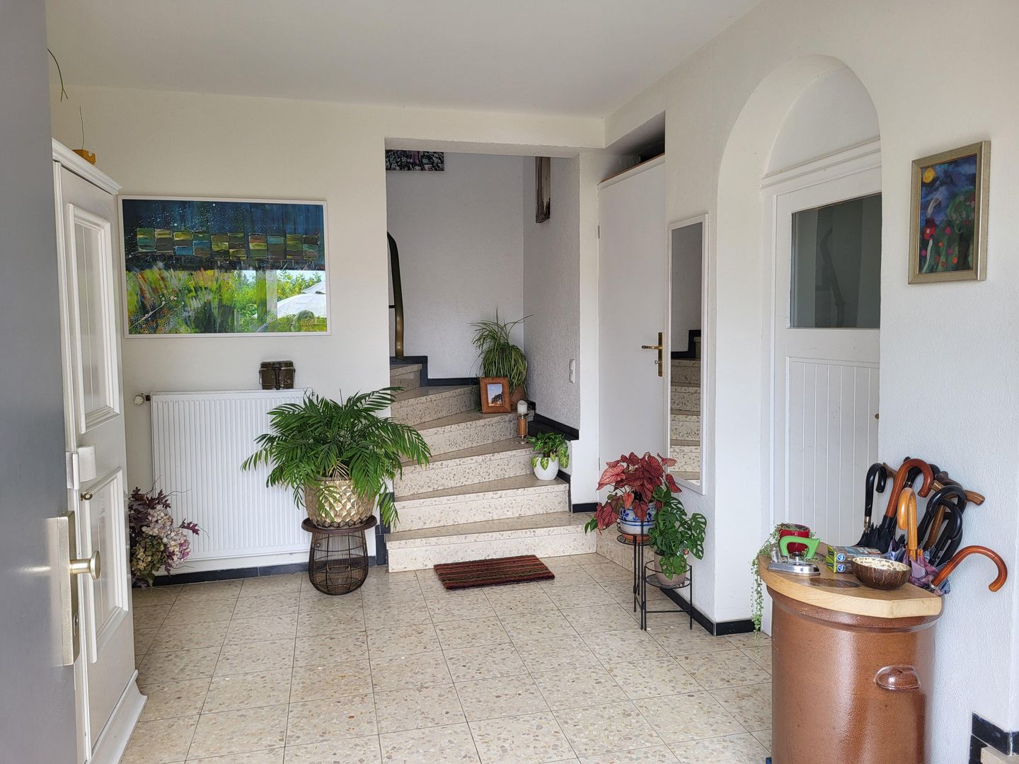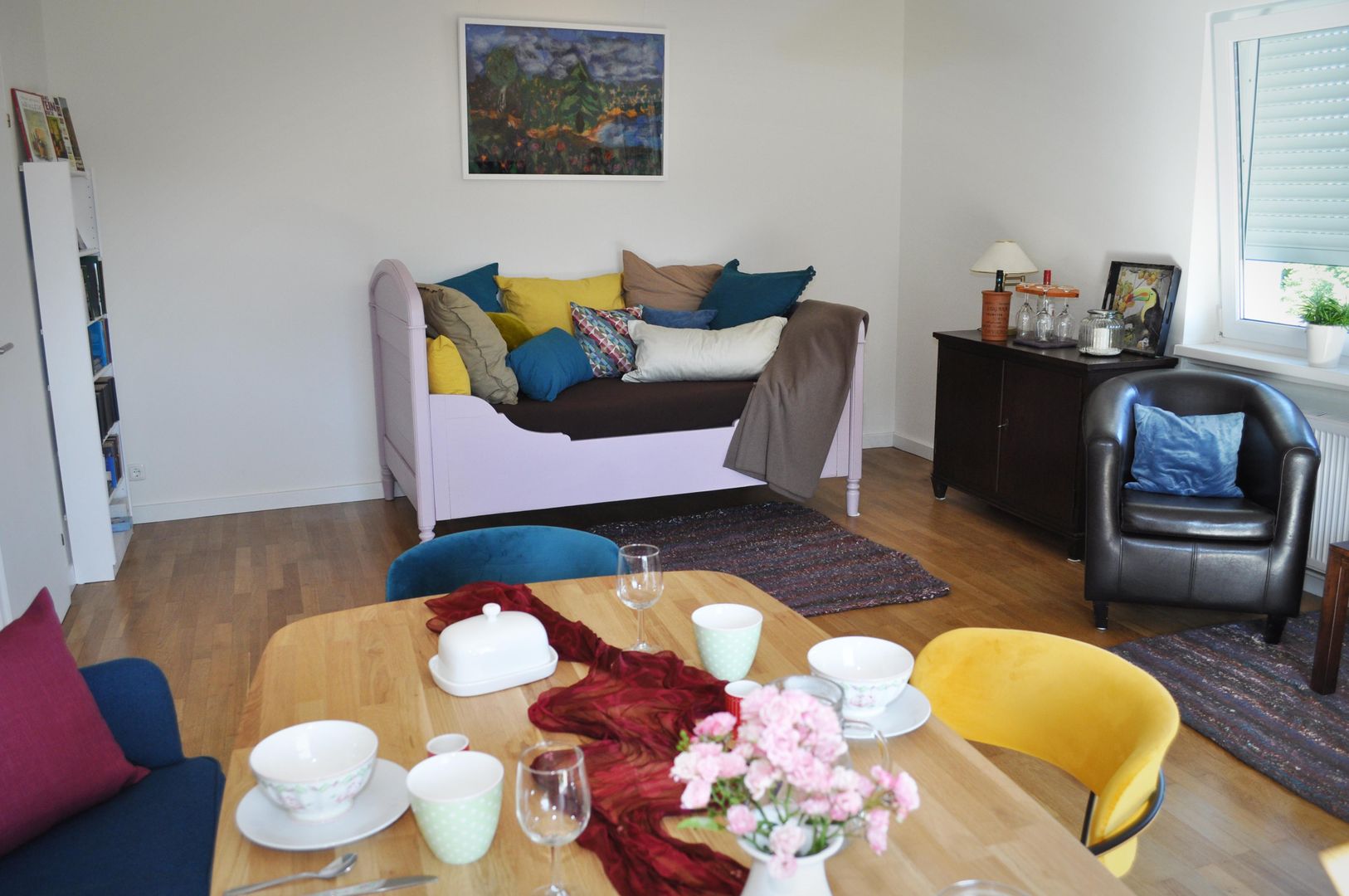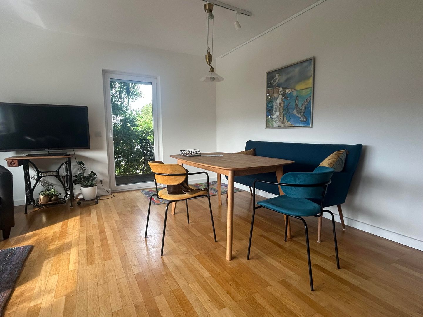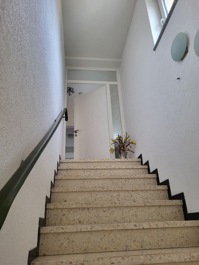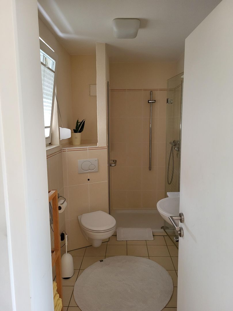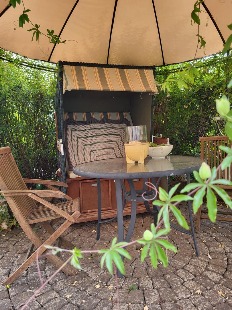 Your 65 square meter vacation home is located in the extension of our 100 year old villa. The spacious double bedroom has a double bed, which can be split into two separate beds on request. The fully equipped kitchen with access to the balcony has a washing machine, a fridge-freezer and plenty of storage space for longer stays in our region. The bathroom with walk-in shower is accessible from the bedroom. All rooms are bright and have exterior windows. In the living room, which also provides access to the balcony shaded by plants, there is a large sofa bed, a dining area and a variety of selected books, especially by authors from the region. We invite you to relax in the hanging chair on the sheltered balcony with a good book and enjoy your stay here to the full.