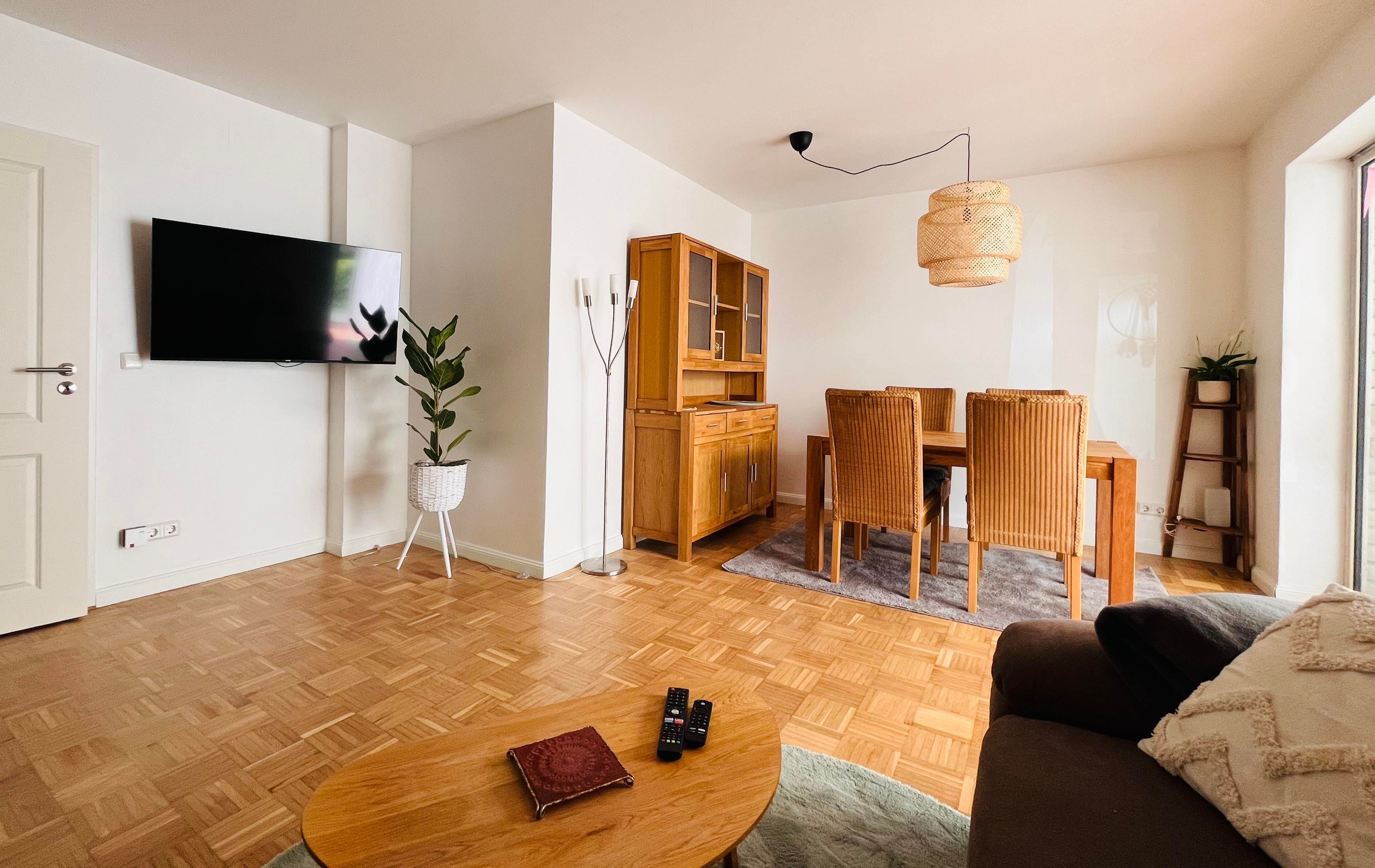 The kitchen is equipped with an oven, hob, fridge, microwave, dishwasher, coffee machine and toaster. In the large living and dining room there is a table that seats up to four people. The TV has Amazon Prime TV and Magenta TV, which our guests are welcome to use. Wifi is of course available in all rooms.