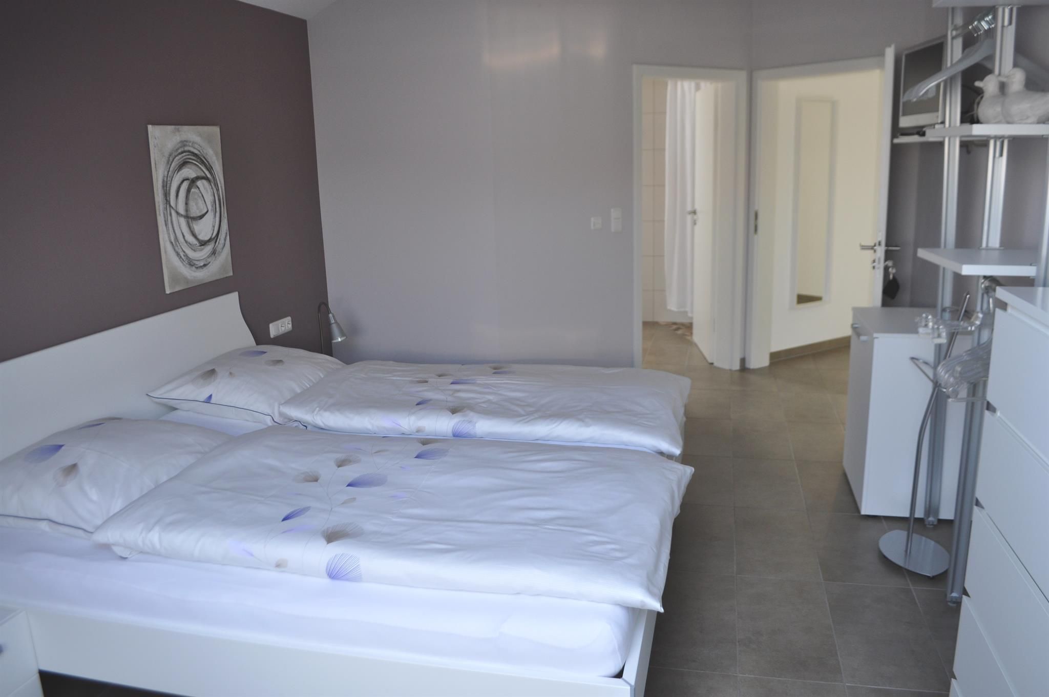 Our modern 4-star holiday flat is bright and friendly furnished. From the spacious living/dining area you can enter your own sunny and panoramic balcony with a south-facing view. The holiday flat has two separate double bedrooms, each with shower/WC and TV.