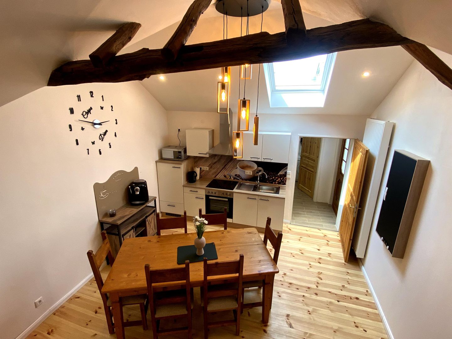 Lovingly renovated vacation apartment in a historic half-timbered house. Here history meets modernity. You can expect a large shower, double bedroom, sleeping balcony, living area with sofa bed and kitchenette plus sideboard with fully automatic coffee machine
