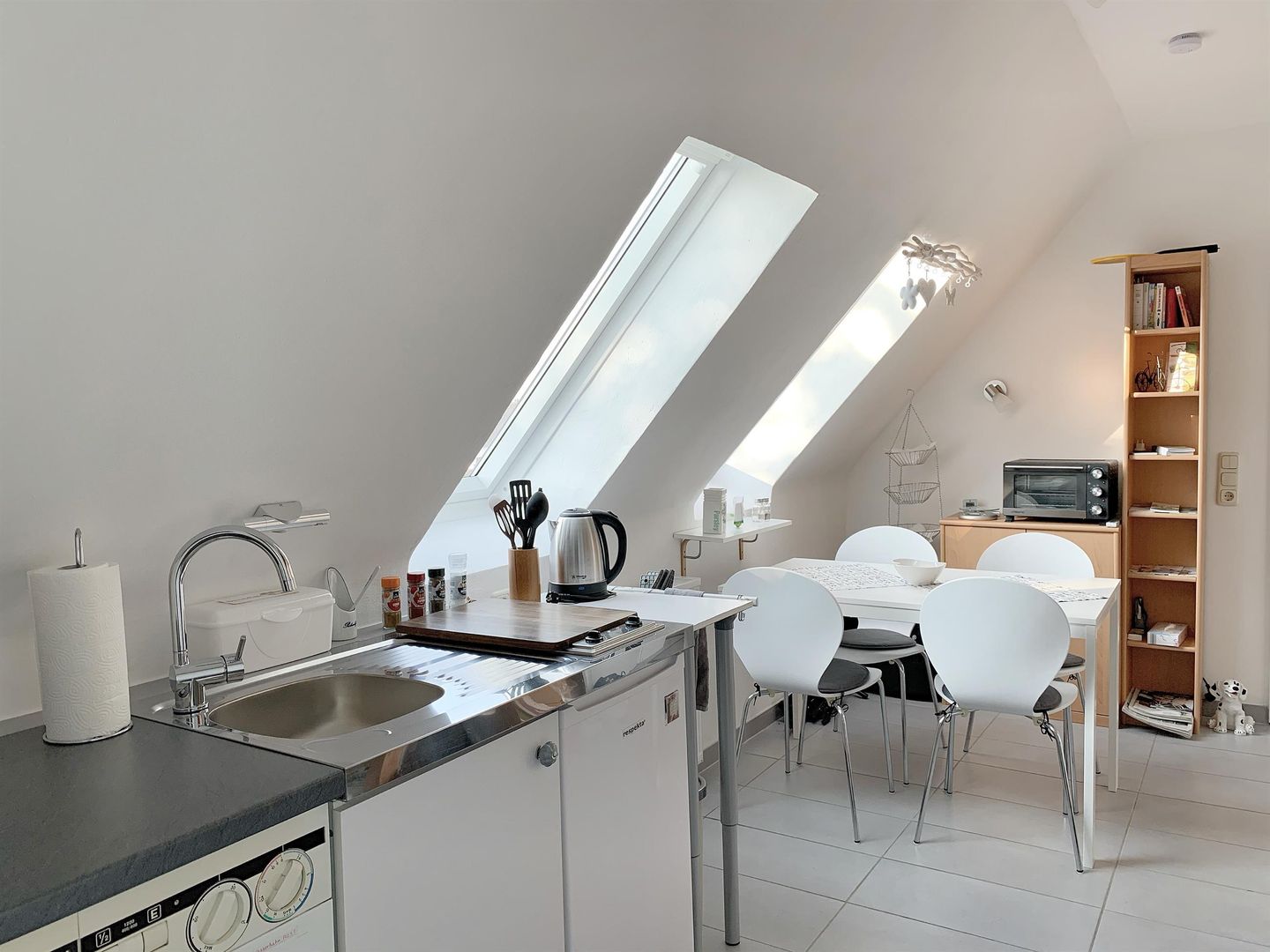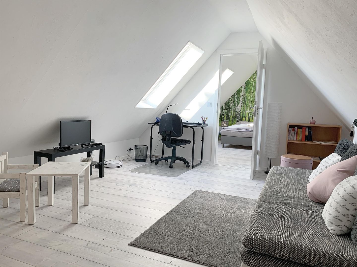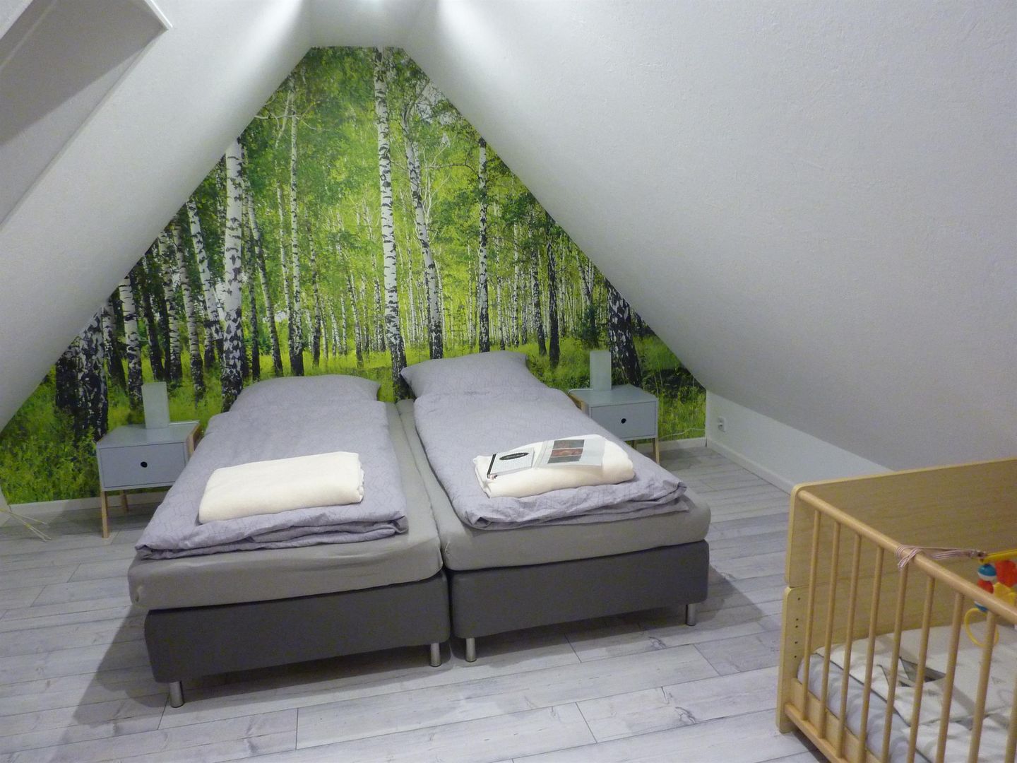 We rent out the cozy Eifel vacation apartment "Schöne Aussicht". The apartment is located in the attic on 2 levels. It has 2 bedrooms each with 2 beds 90 x 200, a crib, a living room with TV, a bathroom with shower and an eat-in kitchen with pantry kitchen and washing machine. The apartment is modern and brightly furnished.