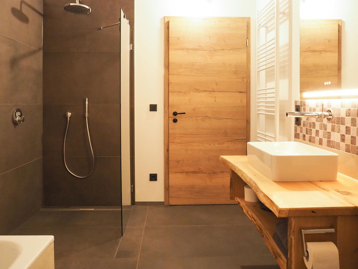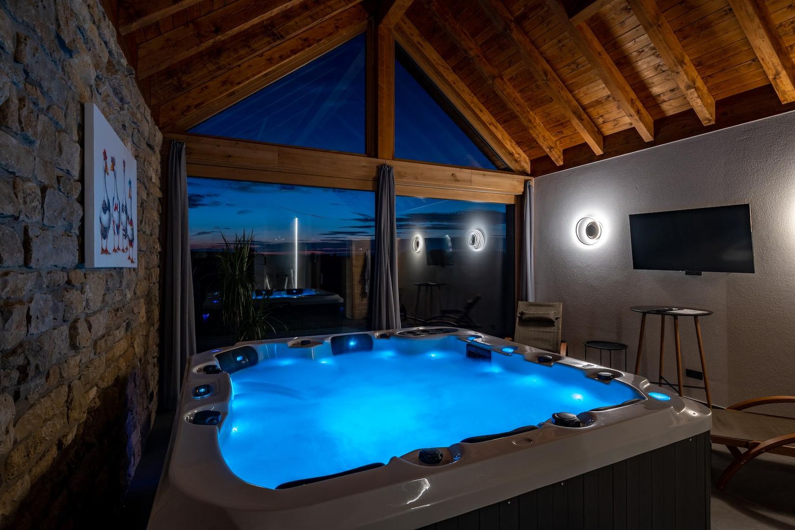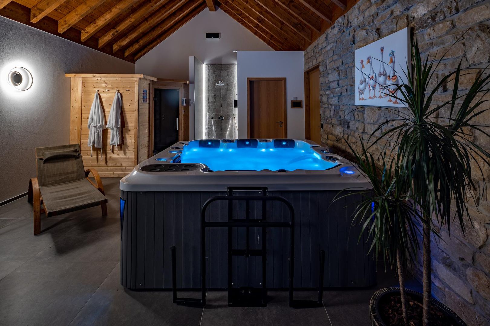 The highlight is the large separate wellness area with whirlpool and sauna.