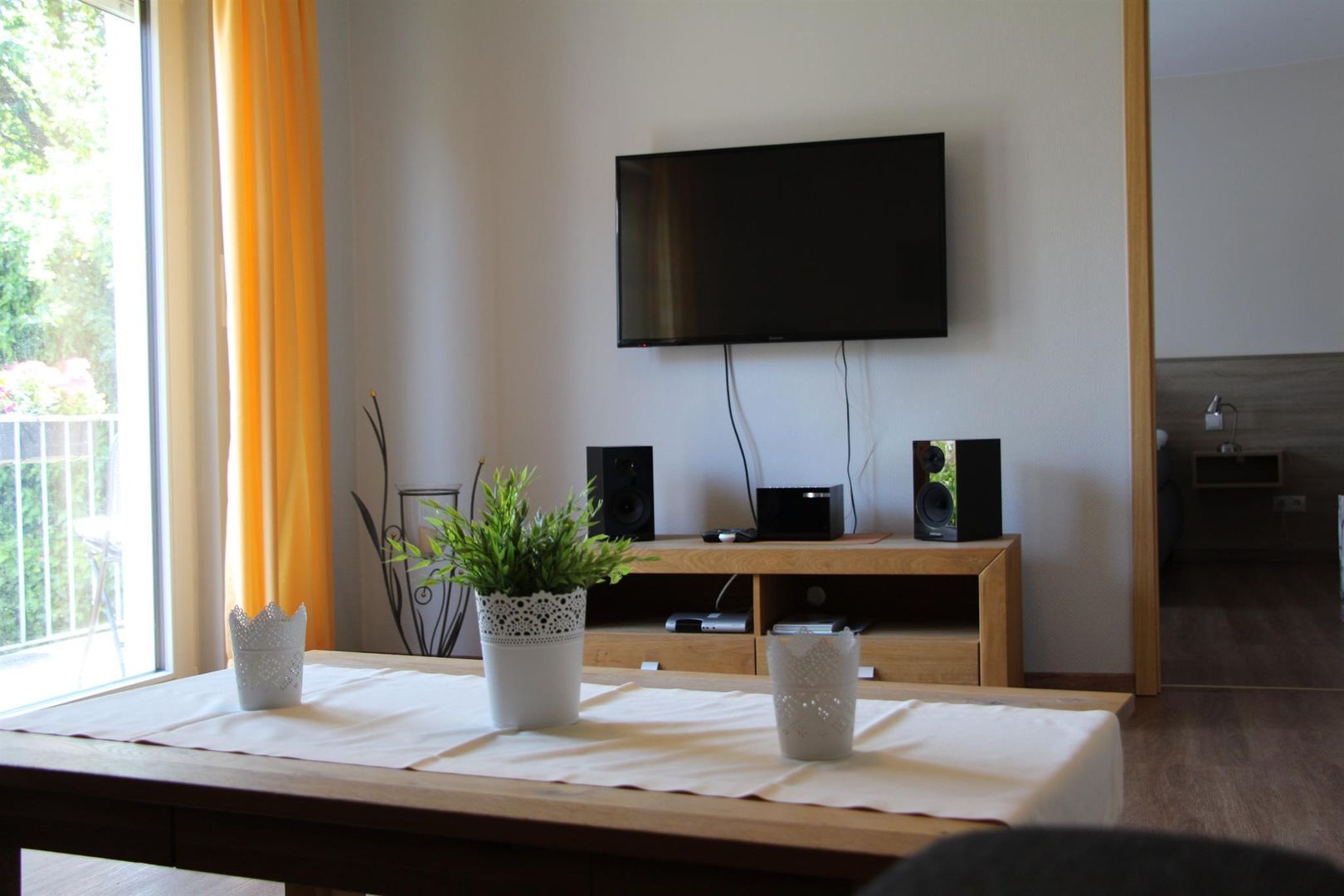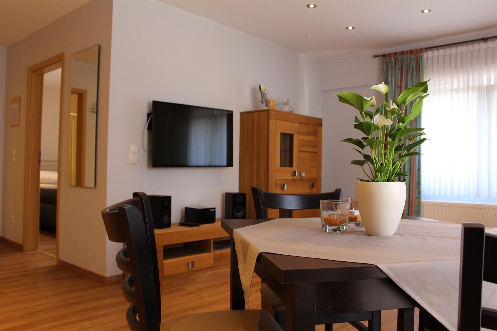 In our annex we have built 2 new 50 m² apartments. Both apartments are on the 1st floor. The beautiful, light-flooded apartments are spacious and ideally suited for 2-4 people. The apartments have a spacious bedroom with box spring bed, wardrobe and space for a travel cot. A large kitchen with a fully equipped new kitchen, dishes and cutlery for 4 people, 4 plate hob with oven, dishwasher, extractor hood, refrigerator, coffee maker, kettle and toaster. In the living area, a cozy couch and a flat-screen TV invite you to relax.