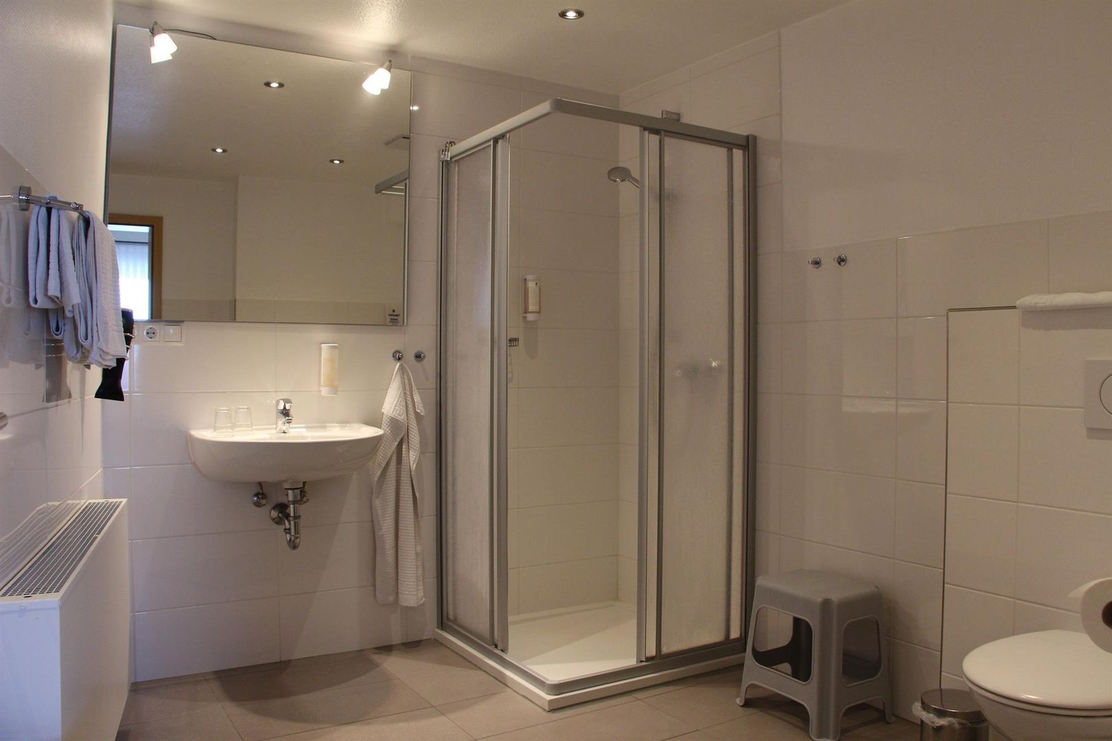 One apartment has access to a sunny south-west balcony. The spacious bathroom has a shower, toilet and sink.
