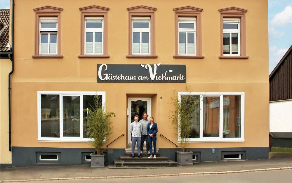 The apartment is located in the guest house at the Viehmarkt, in the crime capital Hillesheim, on the second floor of the over 100 year old house, and is accessible by stairs. It is 74 m² in size and has 2 bedrooms, 1 living room, 1 kitchen, 1 bathroom. The more spacious bedroom has a double bed and a 3-door closet and a suitcase storage. Here, in the bedroom, there is also the spatial possibility to place the children's travel crib. The smaller bedroom is equipped with a pull-out bunk bed for adults and an office table + chair. Both rooms are accessible from the guest hallway. The living room invites you, with its spacious, pull-out couch, just to put your feet up and let the evening end with good music or the TV. If you look out of the living room windows, you will have an excellent view of the directly adjacent cattle market, where every Thursday there is a lively hustle and bustle (market day). In addition, on the opposite side of the street is the Eifel- Alm, an experience gastronomy. All three rooms are additionally equipped with external shutters, which ensure an excellent darkening of the rooms. The spacious kitchen offers a fantastic view of the former city wall from the 13th century as well as a view of the Bolsdorfer Tälchen, with its 1.5 km long barefoot path and its 22 stations as well as numerous hiking trails. Moreover, looking out of the kitchen window, you can enjoy dreamlike sunsets. The spacious kitchen table can seat 6 people + a child's chair, so the whole family can comfortably sit here and play board games after dinner. The bathroom is equipped with a bathtub, WC, WB, hairdryer and a potty. A changing mat is also available, as well as a baby bath and children's dishes in double quantity. A washing machine and a dryer are located in the small utility room of the guest apartment and can be used free of charge. The tourist tax of € 1.50 per person is included as well as 1 bottle of natural wine per person and a bottle of wine on arrival and the energy costs. Bed linen and one large + one small towel per person (for use during the stay) are charged at € 15,- per person. The price for the final cleaning is € 80,-/25,-.
