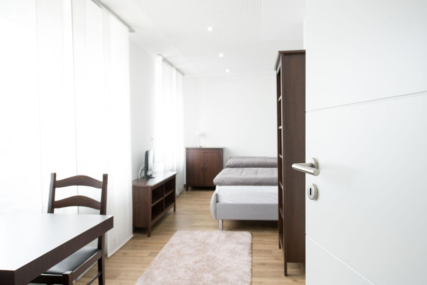 • A bright, modern room with two beds and a small table. The walls are in neutral colors, and large windows provide plenty of daylight.