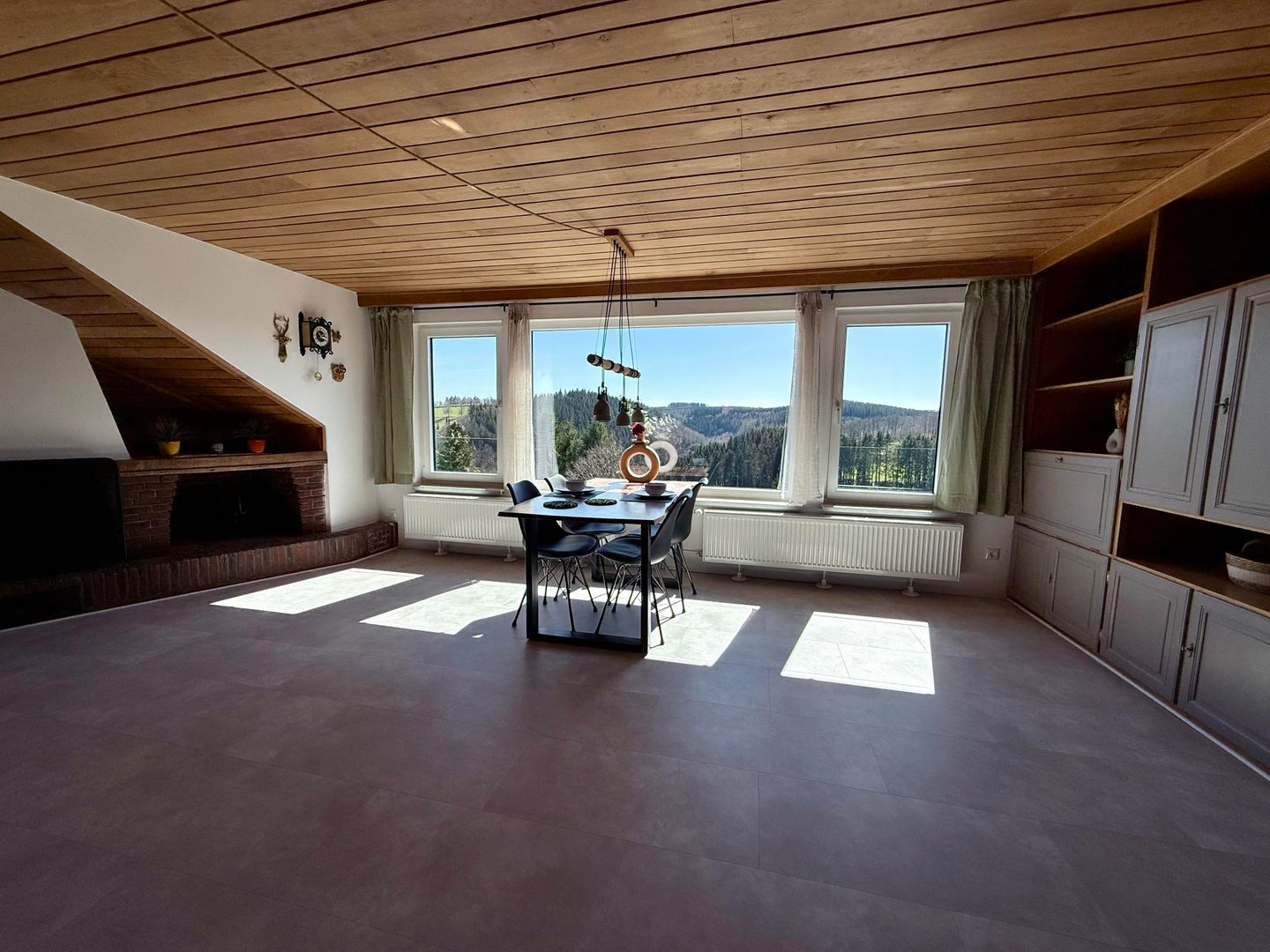 The spacious living/dining room is equipped with a flat-screen TV and the decorative fireplace in the living room area creates a cozy atmosphere. From the dining area you can enjoy a wonderful view over the valley of Monschau.