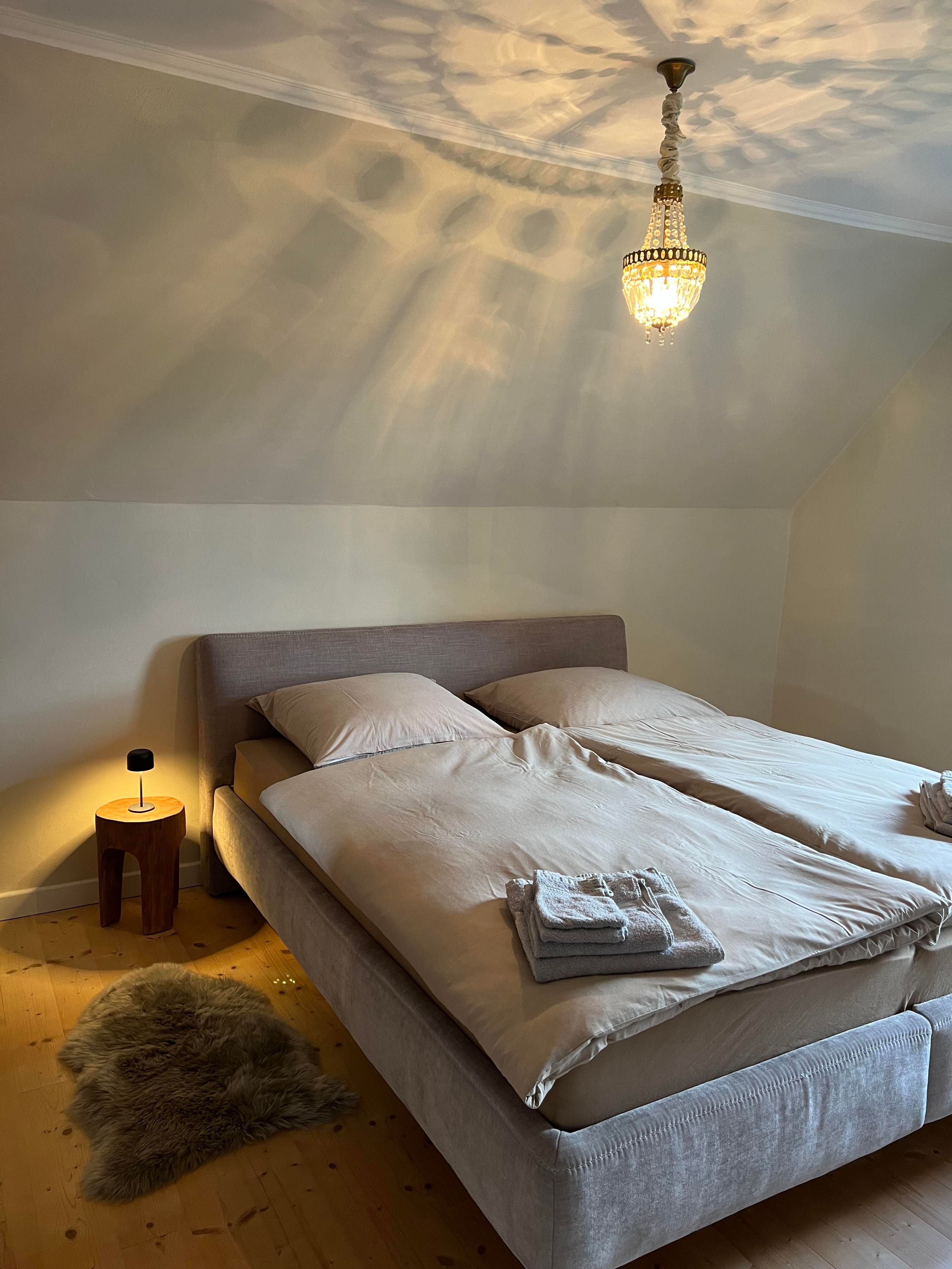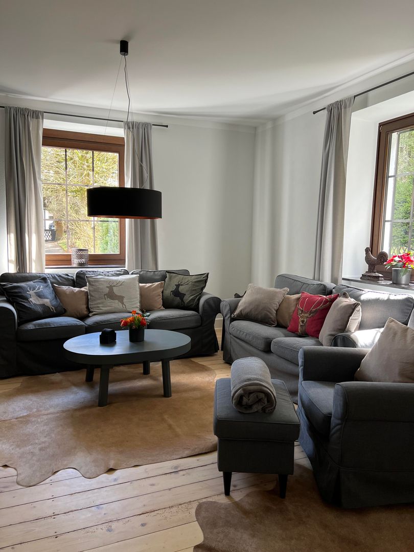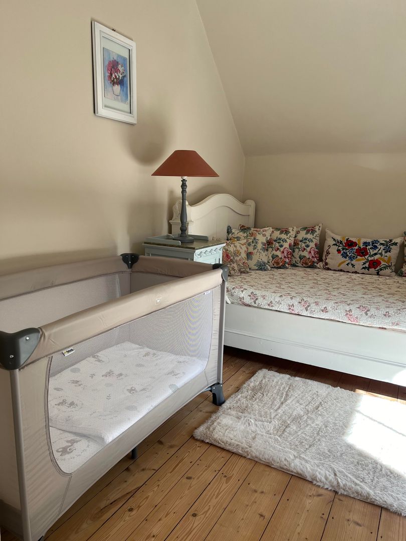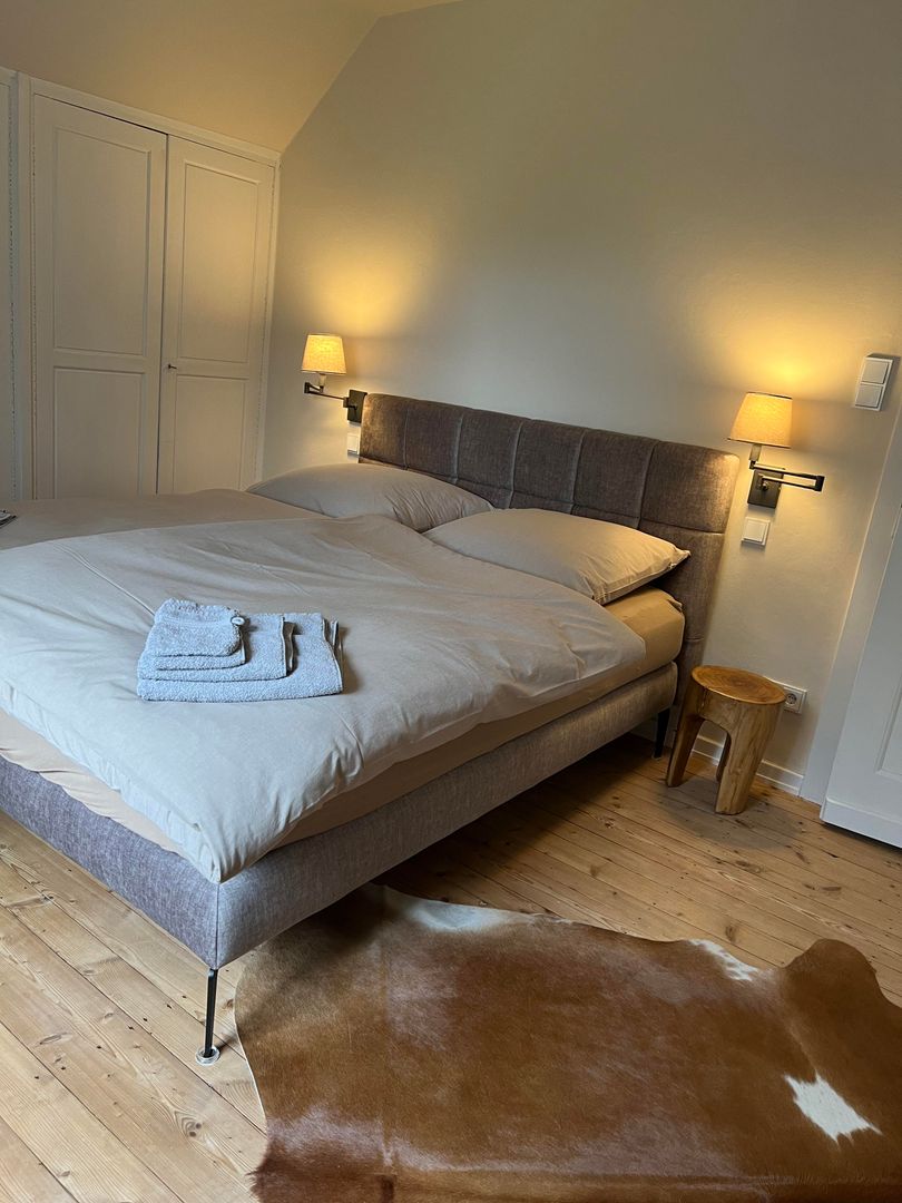 In the outdoor area, you will find a spacious garden with a bench, two loungers, and garden furniture, as well as a terrace that is also equipped with garden furniture, a sun umbrella, and a grill. With good weather, nothing stands in the way of a shared barbecue with a view of the greenery. The property is fenced and therefore also suitable for children and dogs. Cars can be parked free of charge on three private outdoor parking spaces. Pets are warmly welcome upon request.