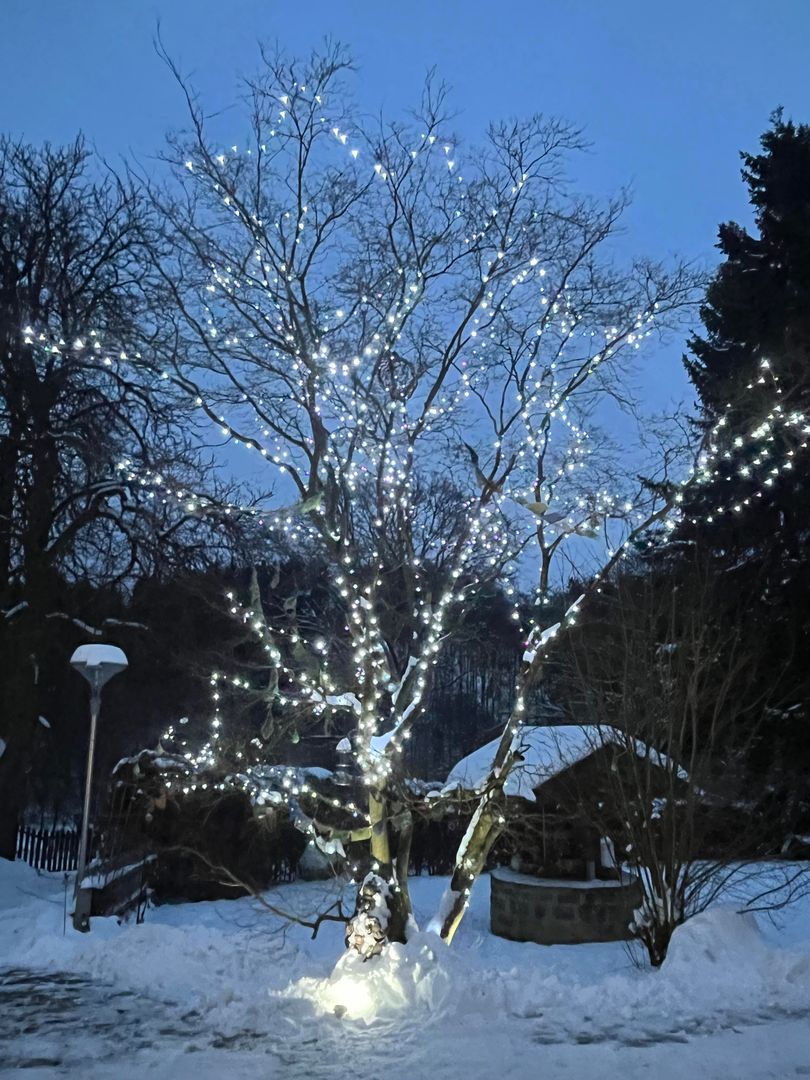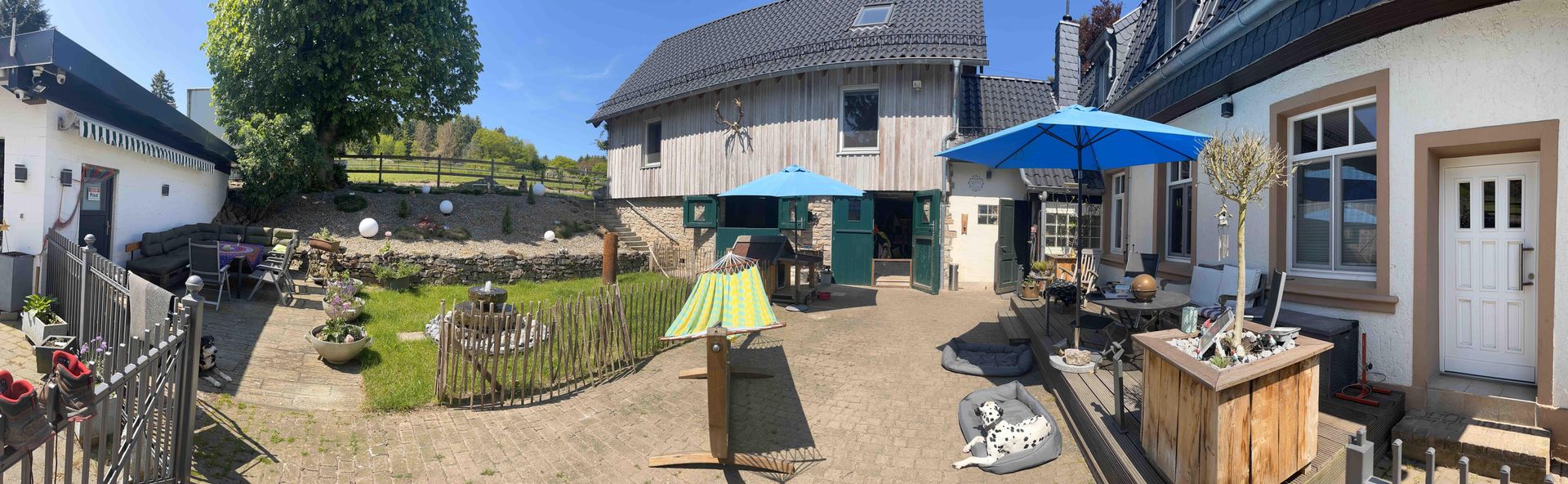 Your gaze wanders over the meadows, where hares and hedgehogs say "good night" to each other, up to the edge of the forest or into our inner courtyard with our millstone fountain.