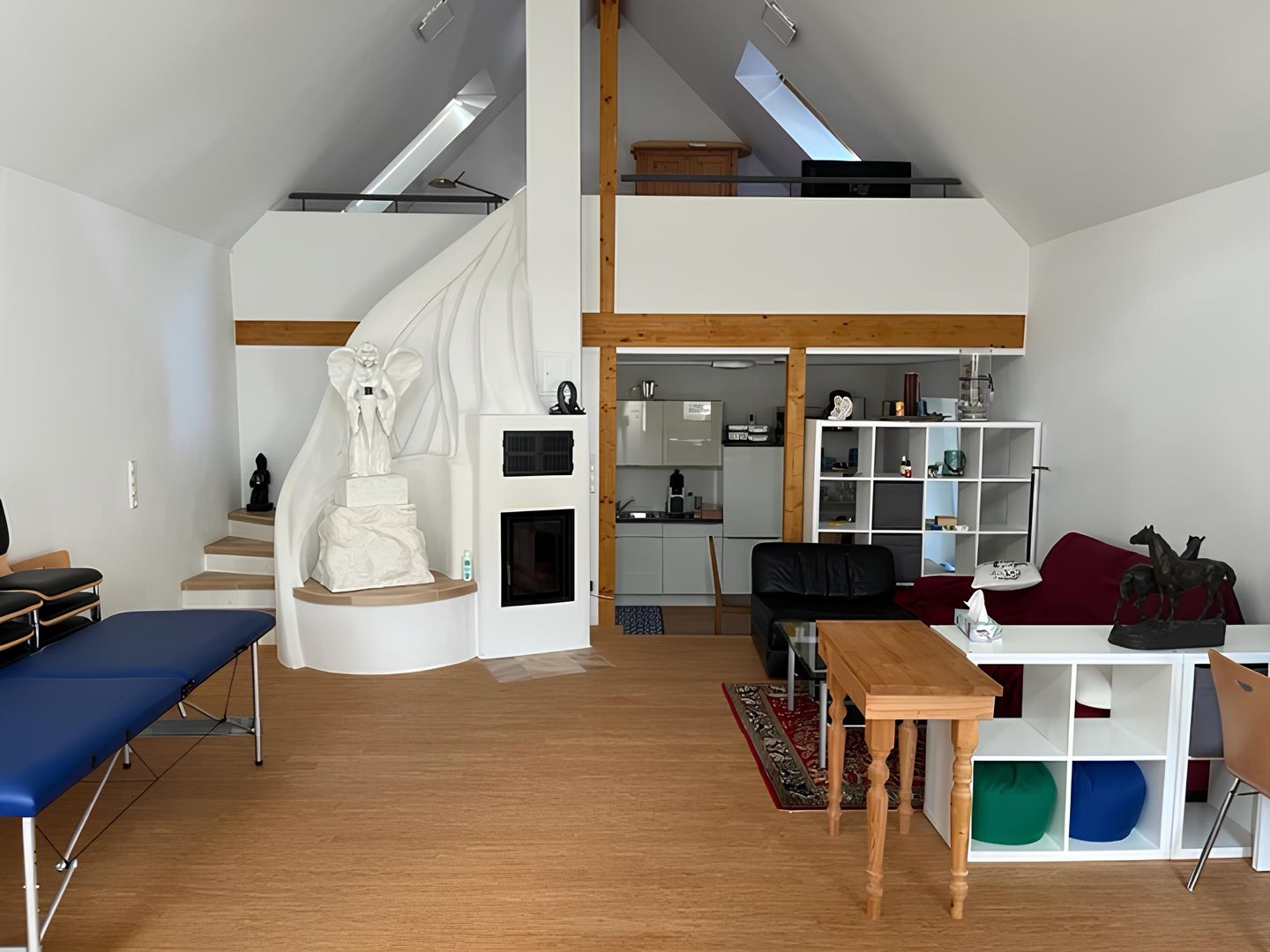 A fireplace with seating is integrated in the staircase to the gallery.