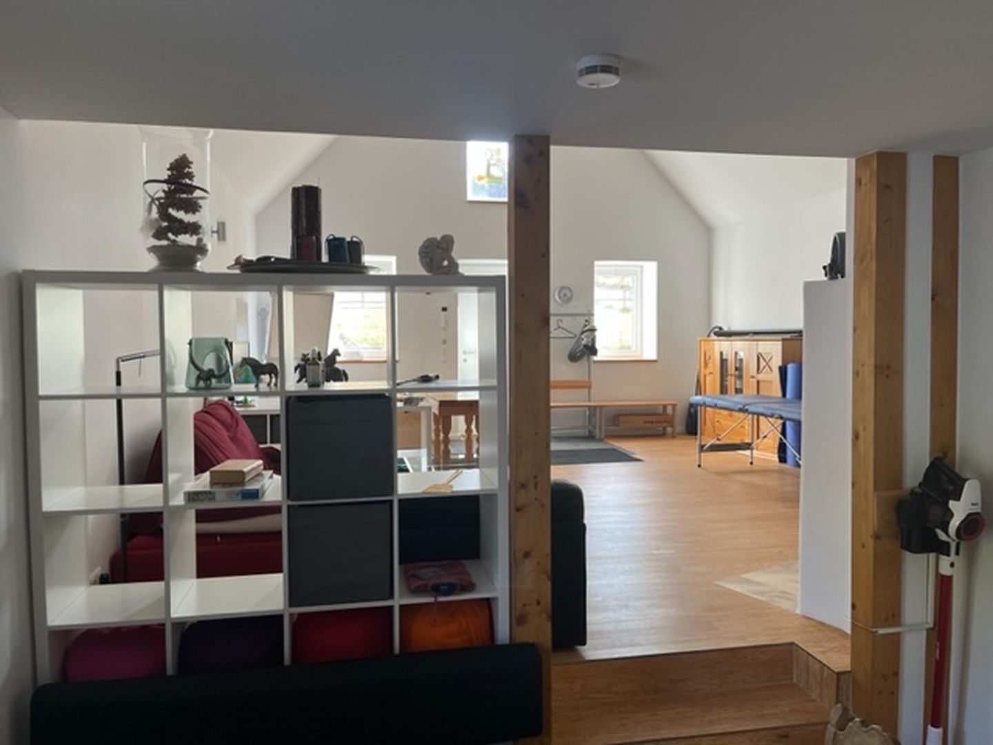 The gallery is located above the kitchen and shower room. This is also fitted with bamboo parquet flooring and can be reached via a staircase. The main room has a 5m high ceiling,