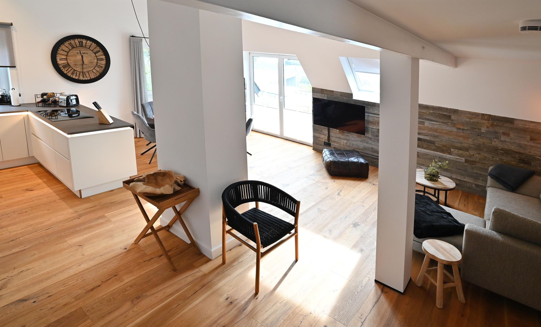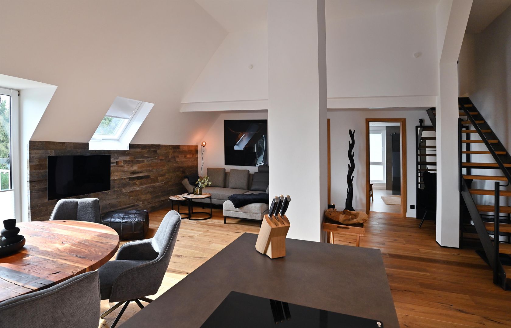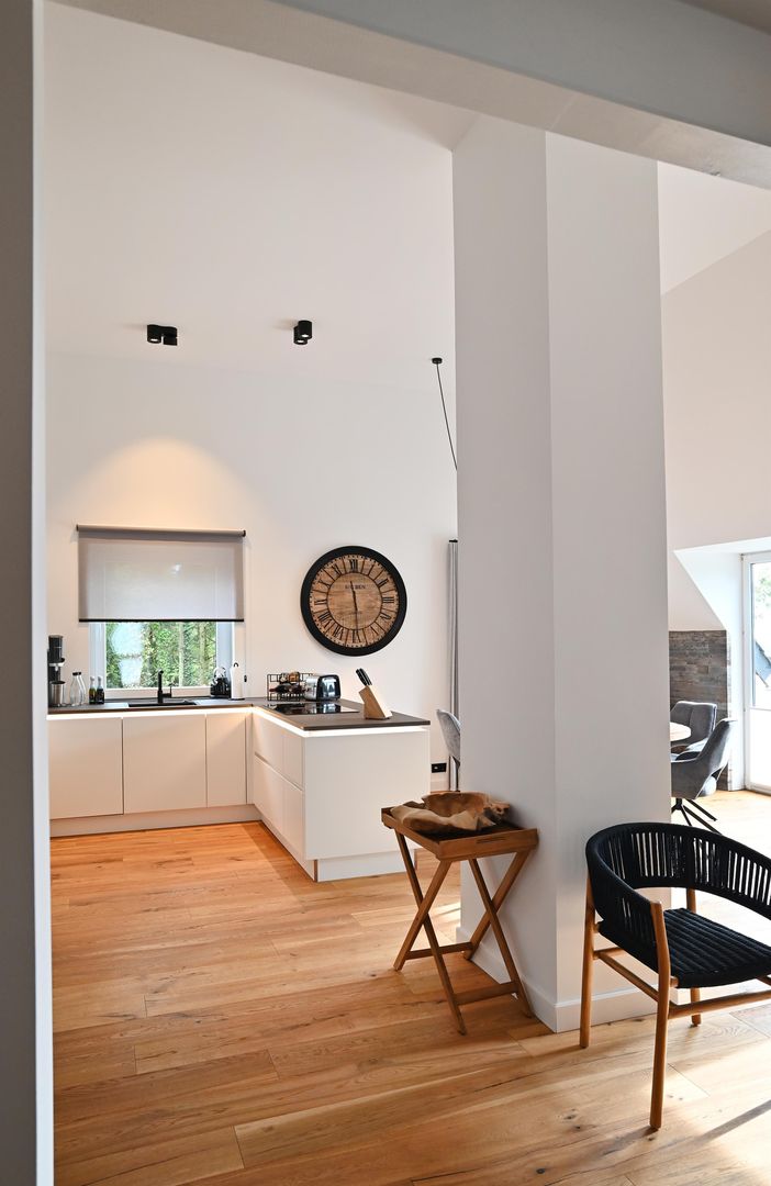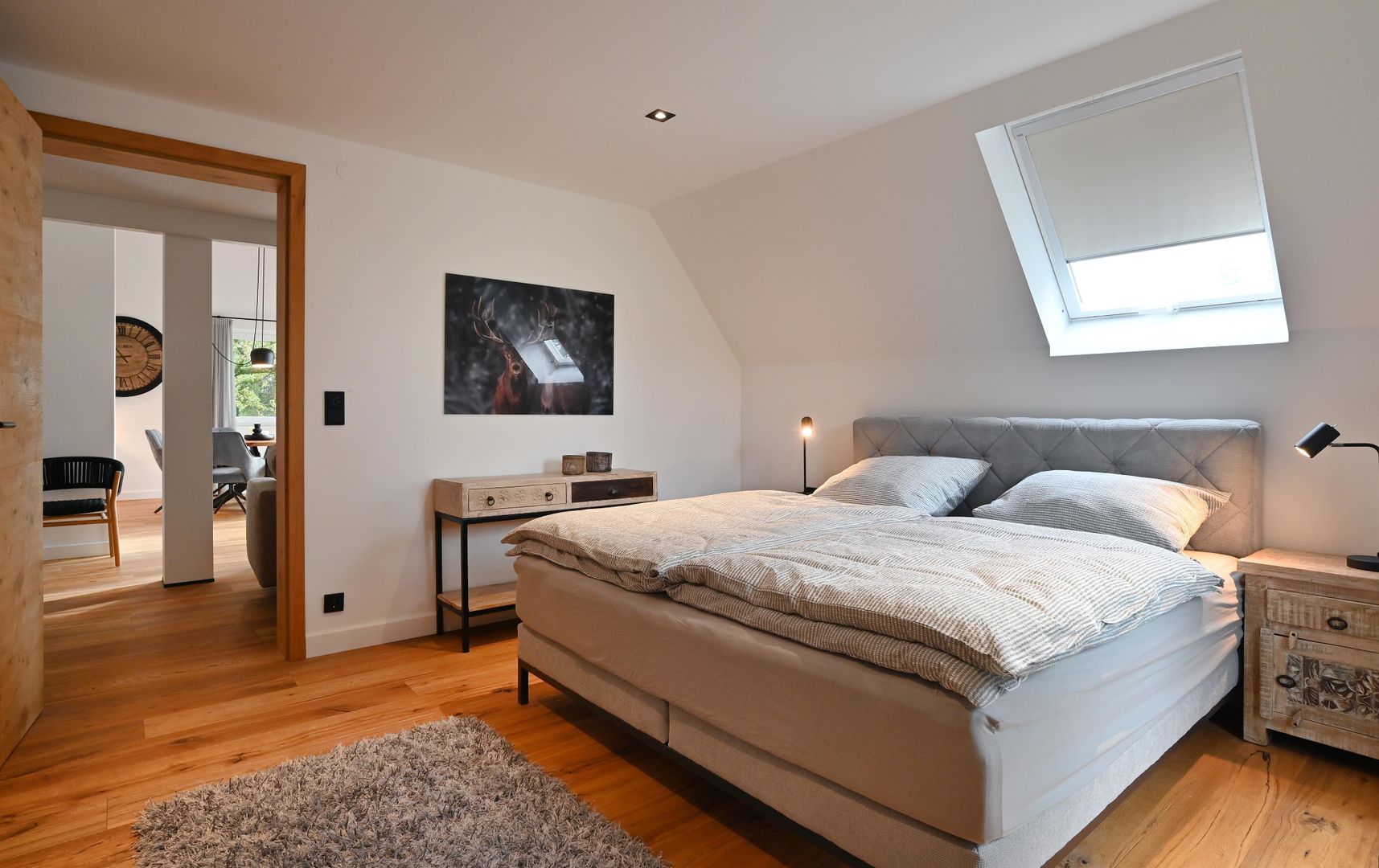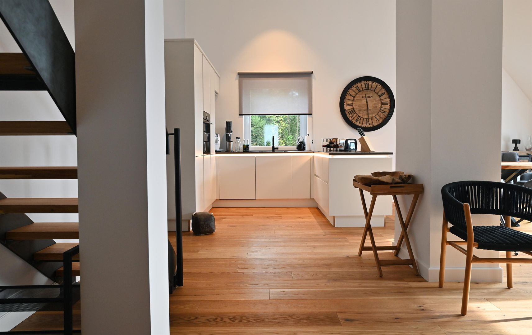 The modern kitchen invites you to cook extensively, the round dining table offers space for six people and is ideal for communal meals. Real wood floors and real wood doors give the flat a warm atmosphere. Practical amenities such as a washing machine and dryer are also available.