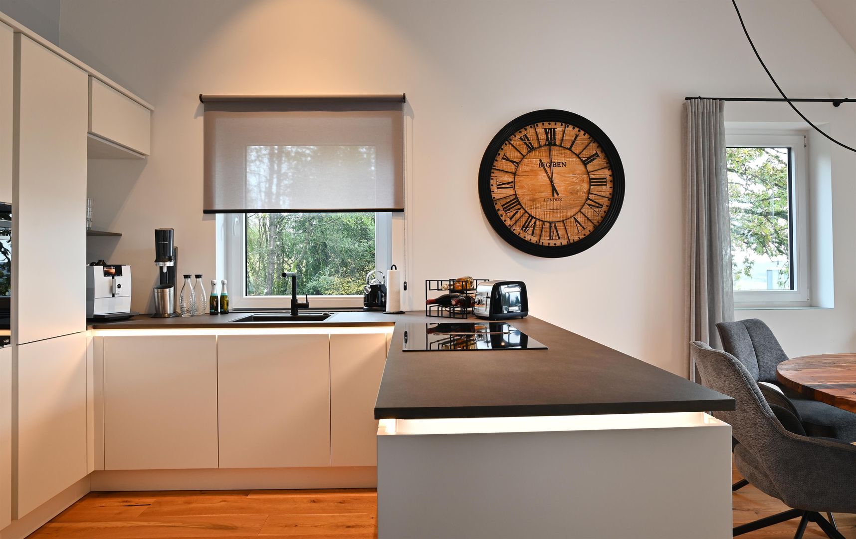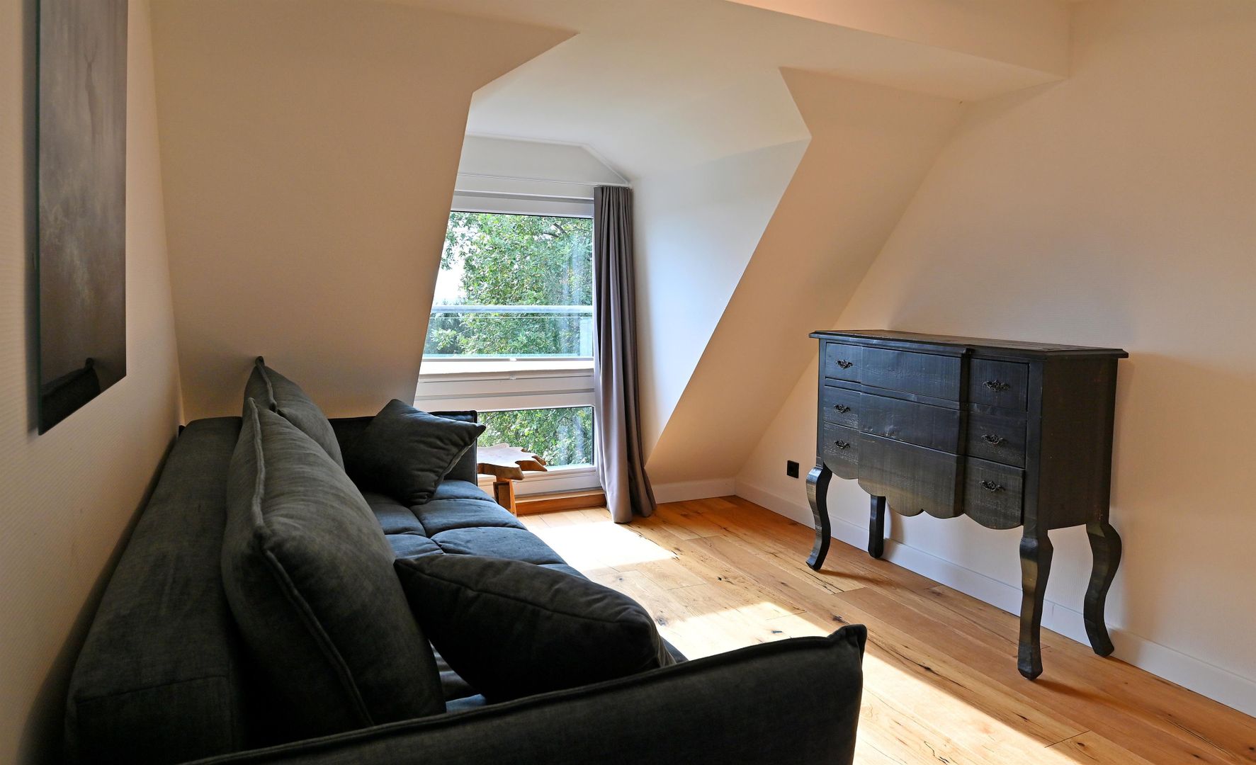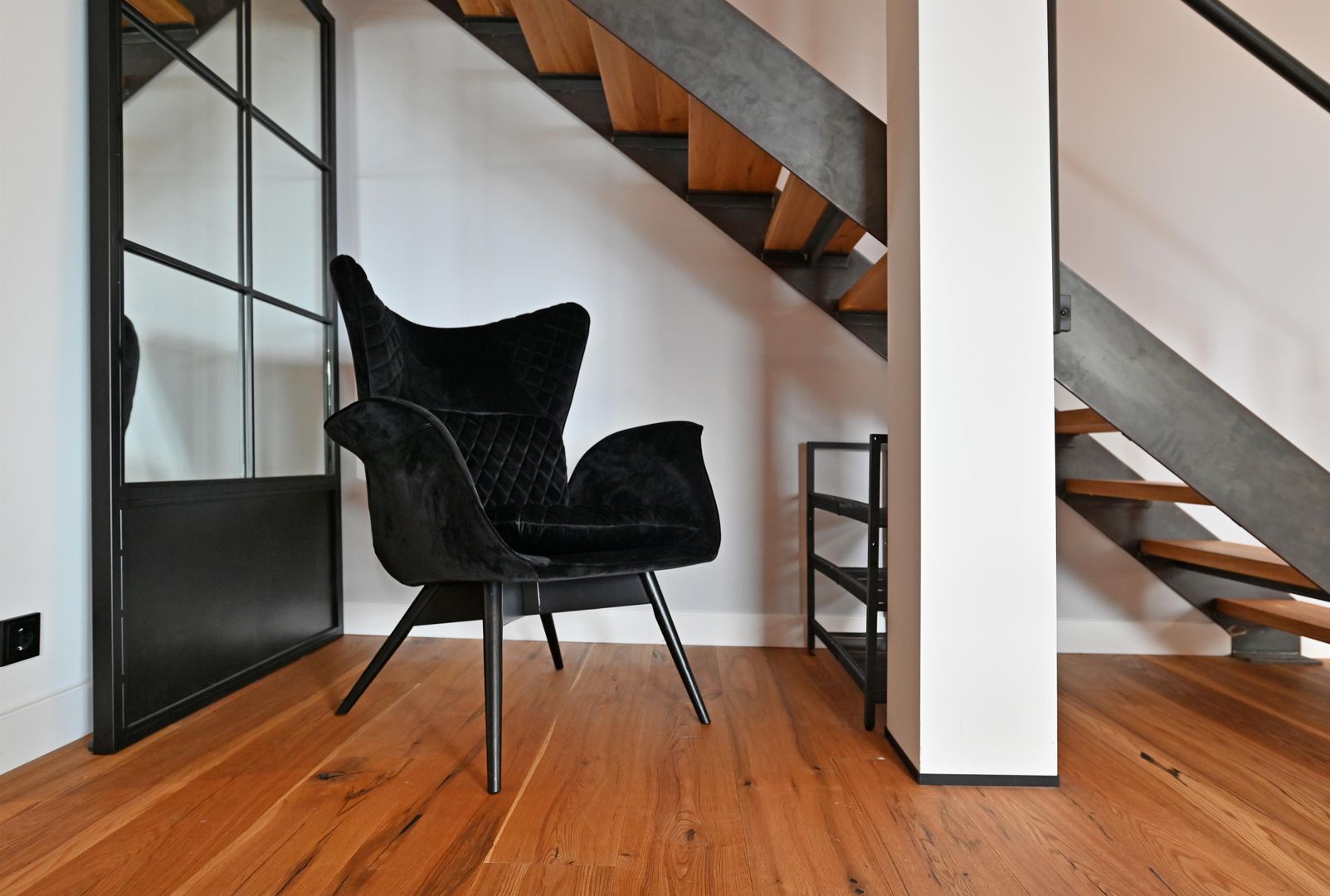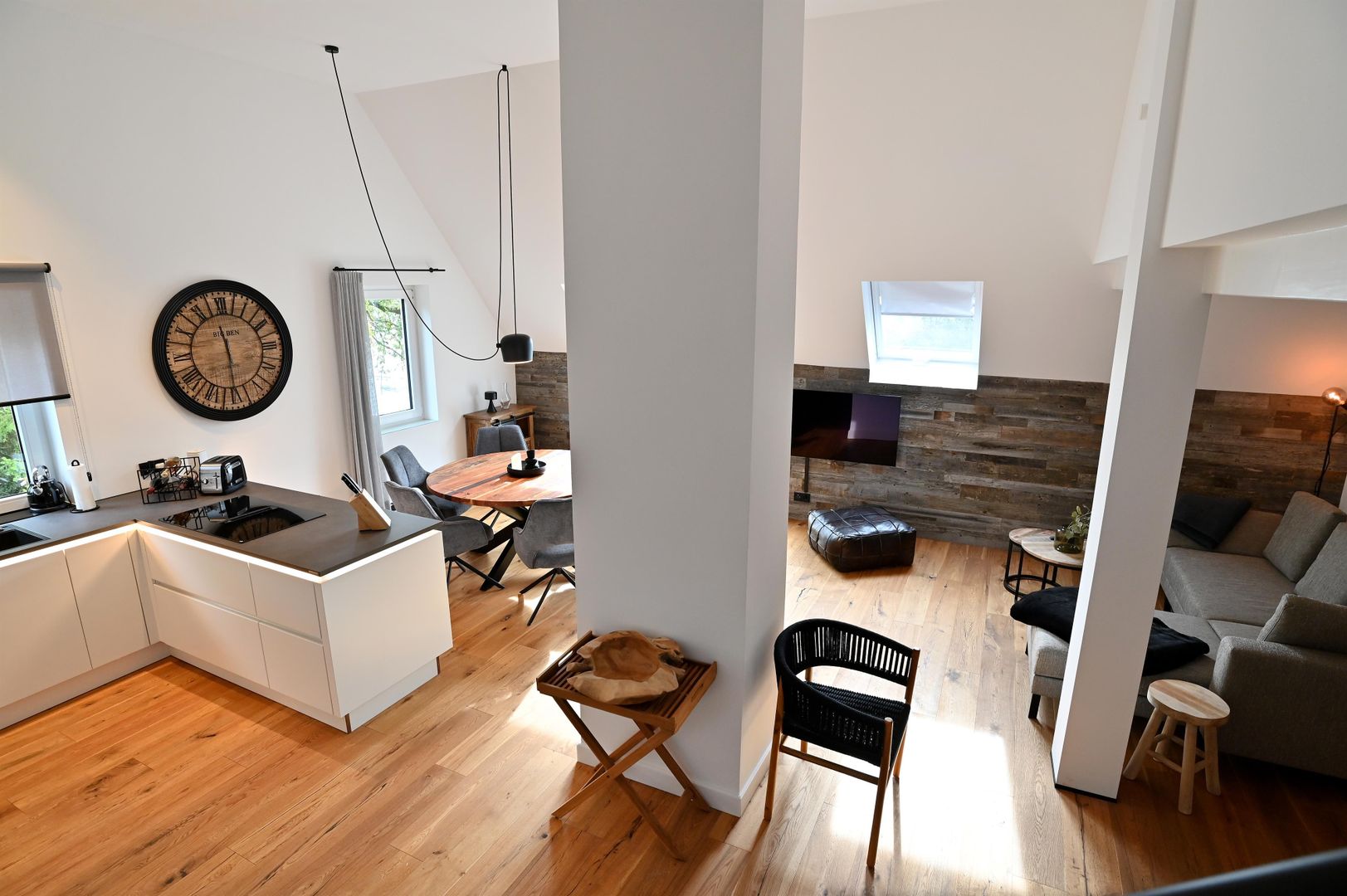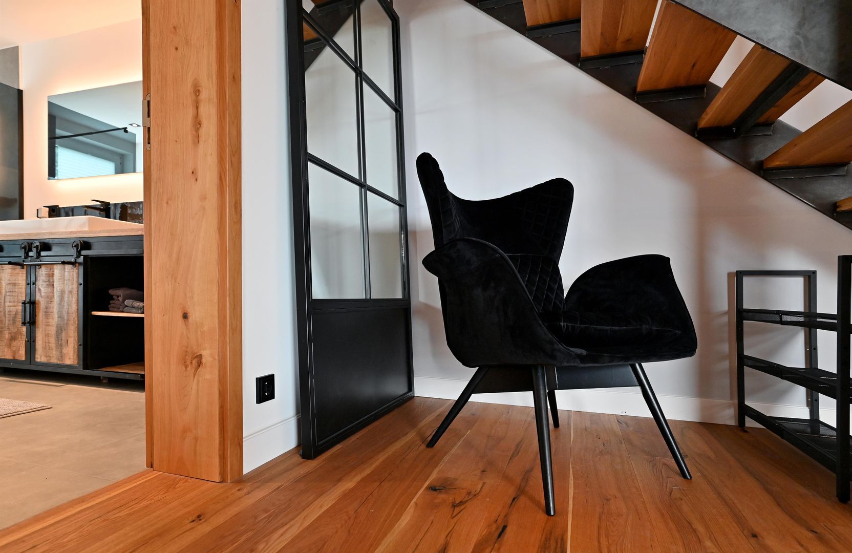 The modern kitchen invites you to cook extensively, the round dining table offers space for six people and is ideal for communal meals. Real wood floors and real wood doors give the flat a warm atmosphere. Practical amenities such as a washing machine and dryer are also available.
