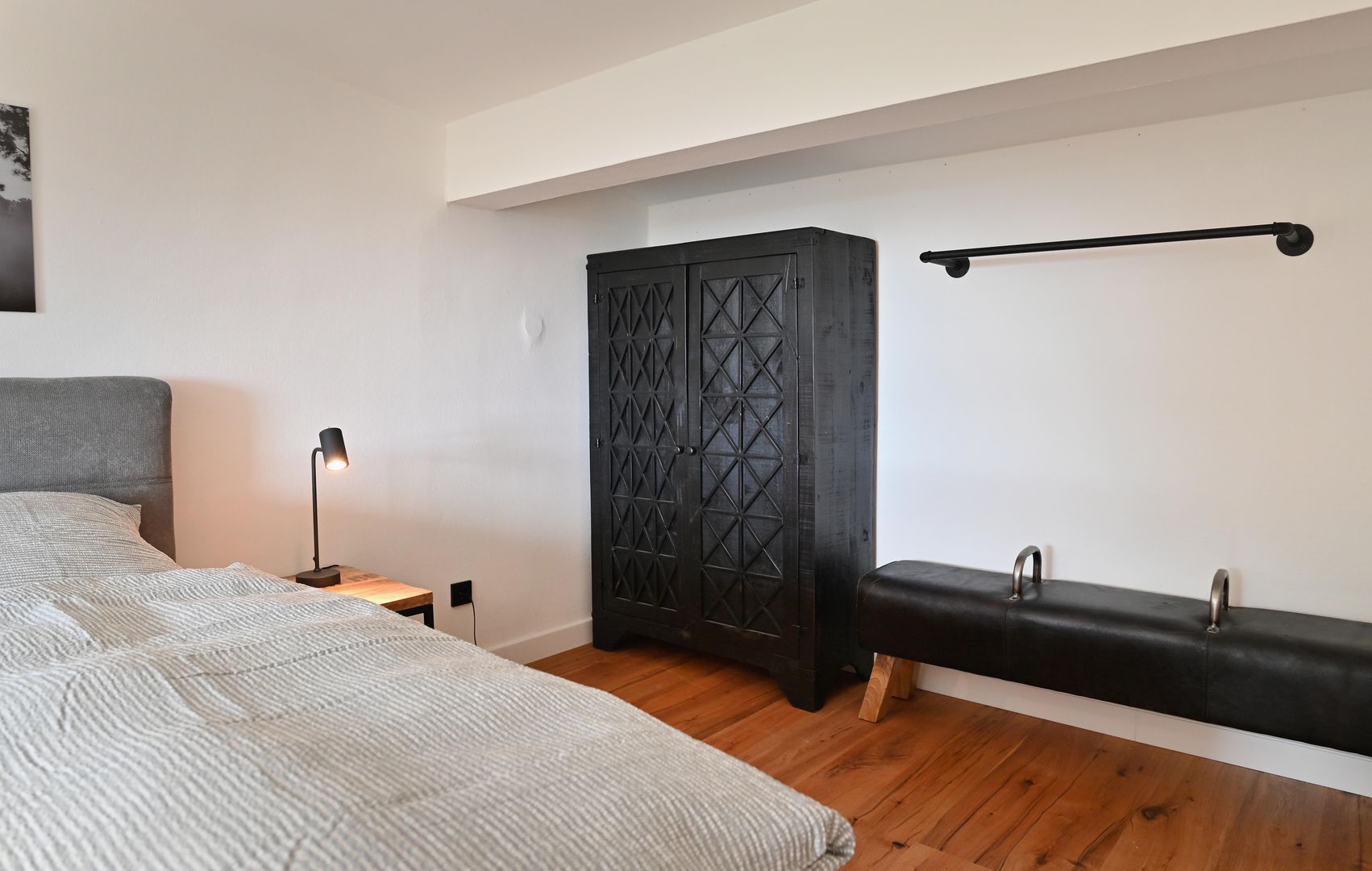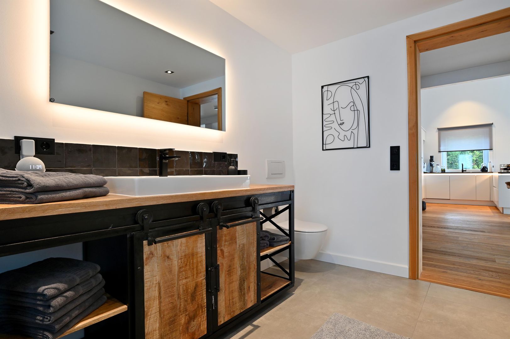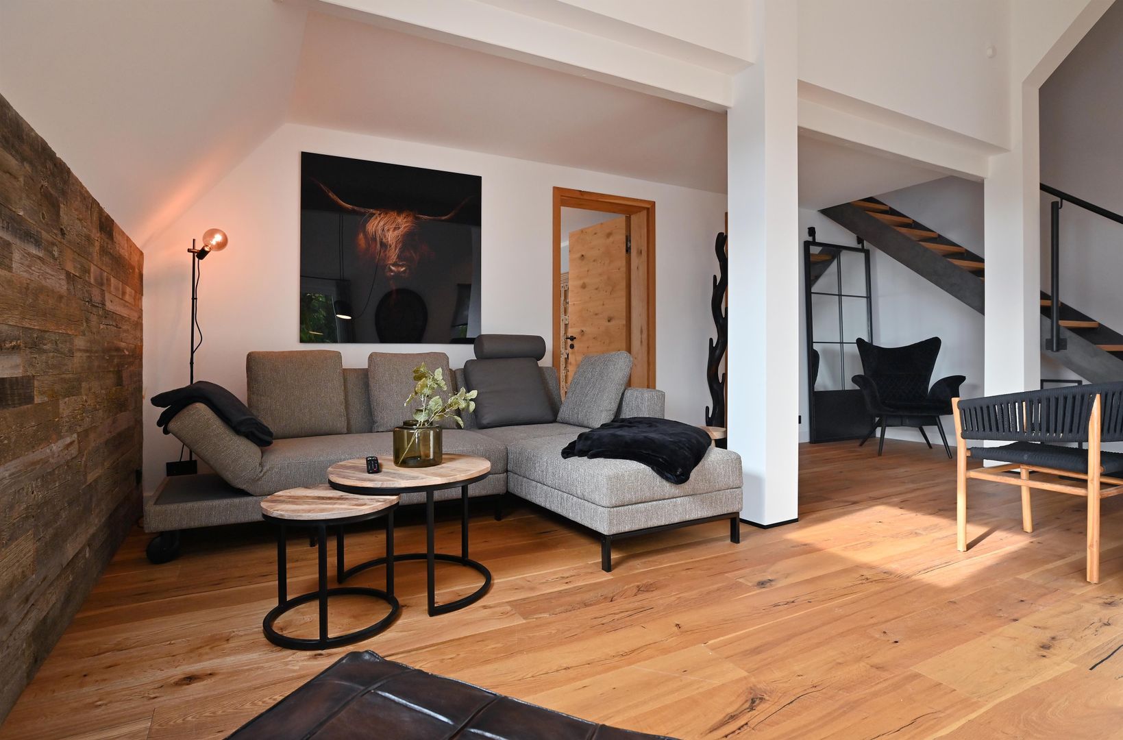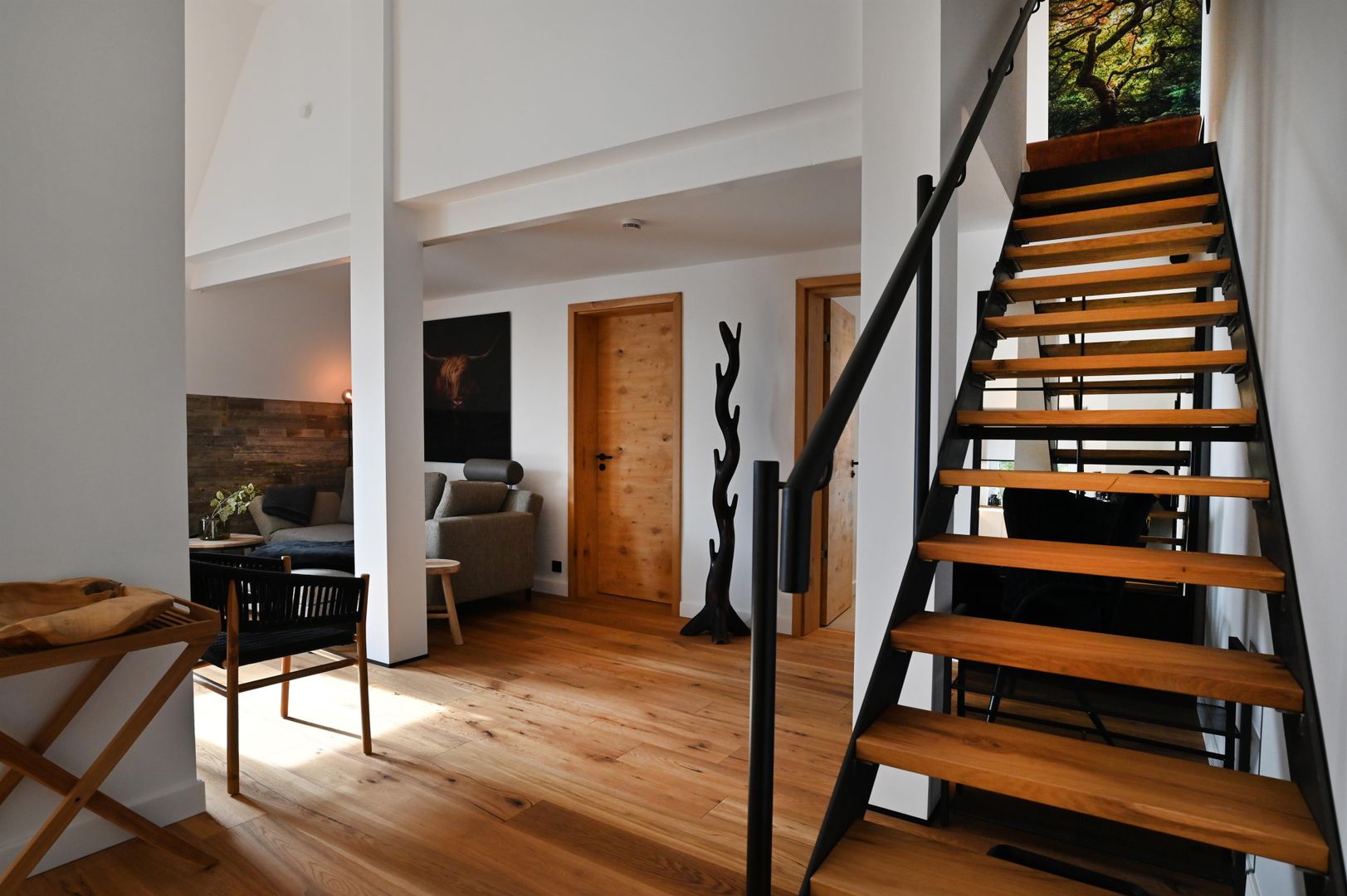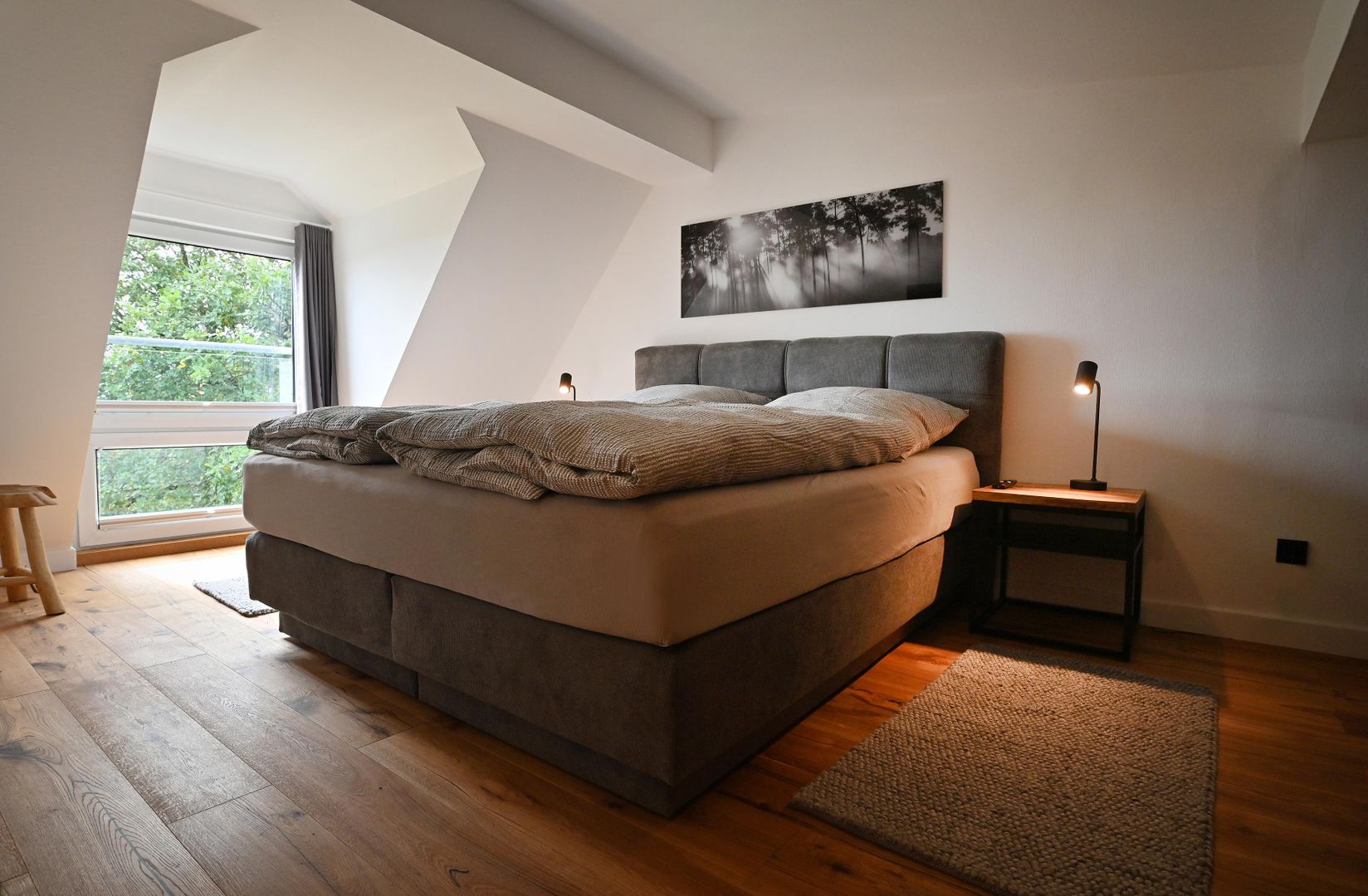 The modern kitchen invites you to cook extensively, the round dining table offers space for six people and is ideal for communal meals. Real wood floors and real wood doors give the flat a warm atmosphere. Practical amenities such as a washing machine and dryer are also available.
