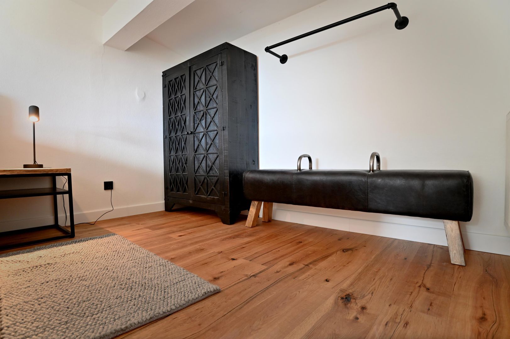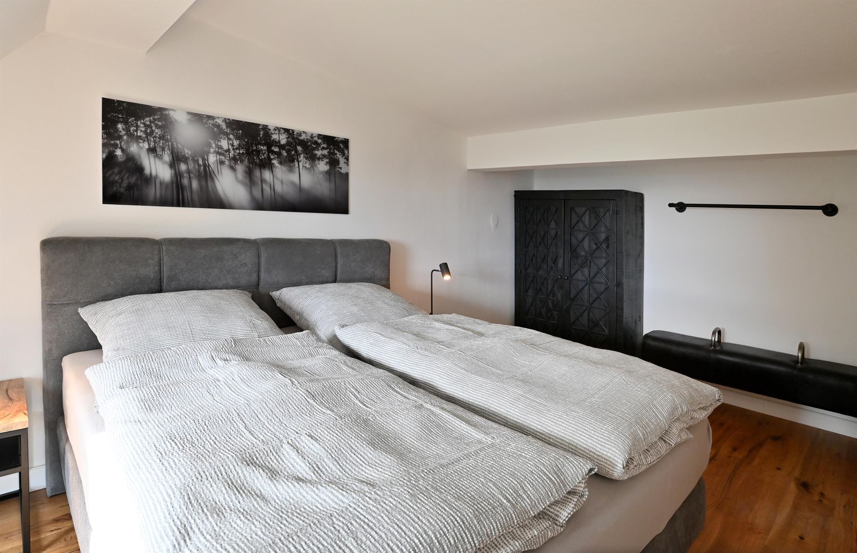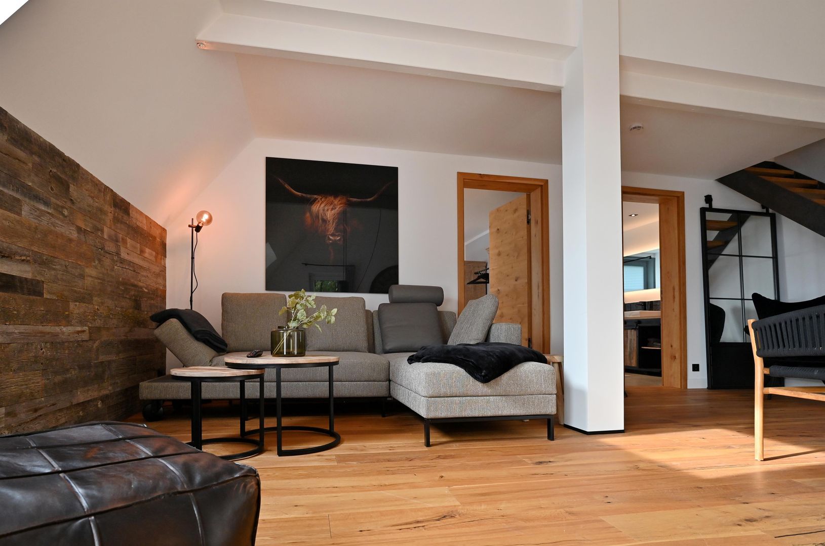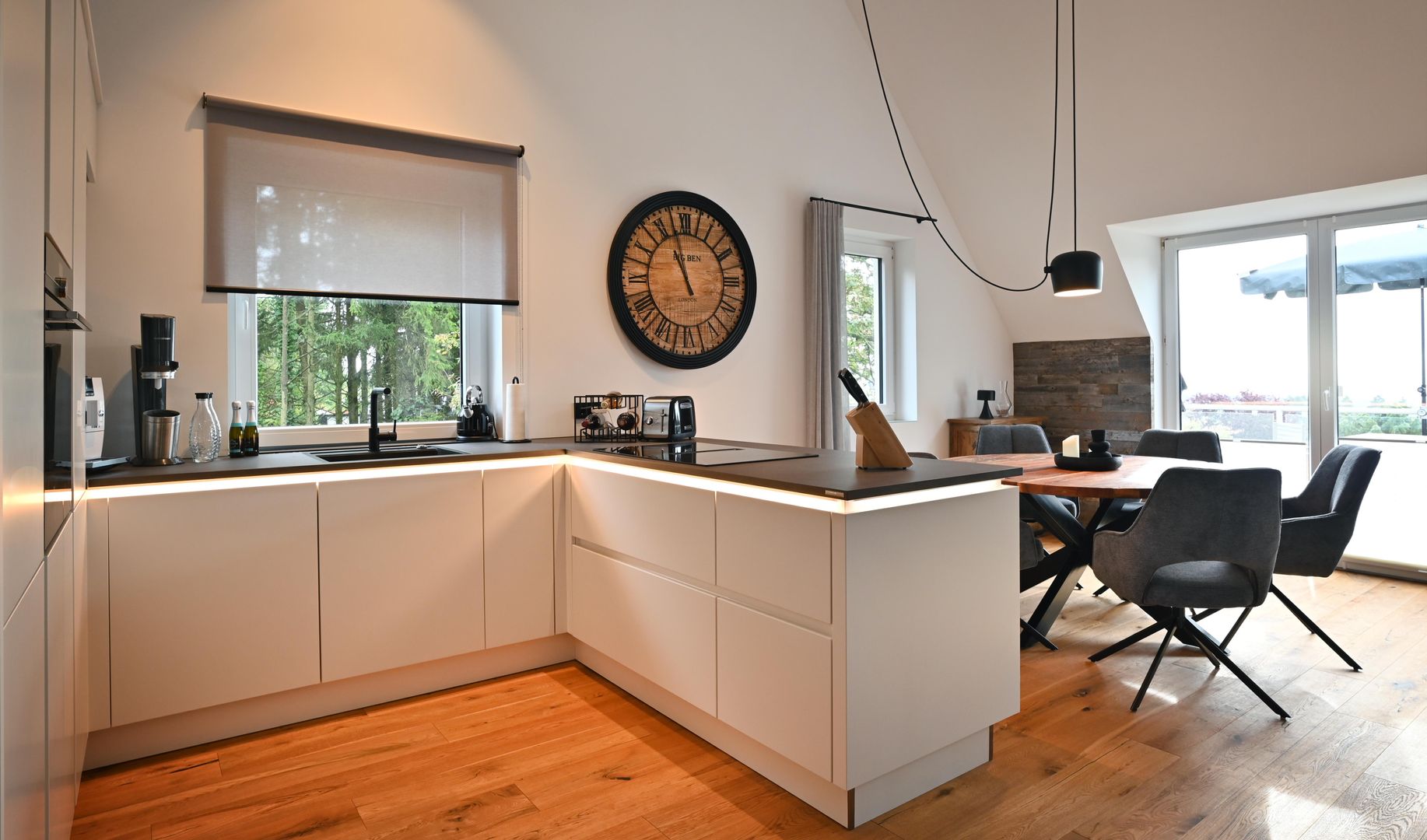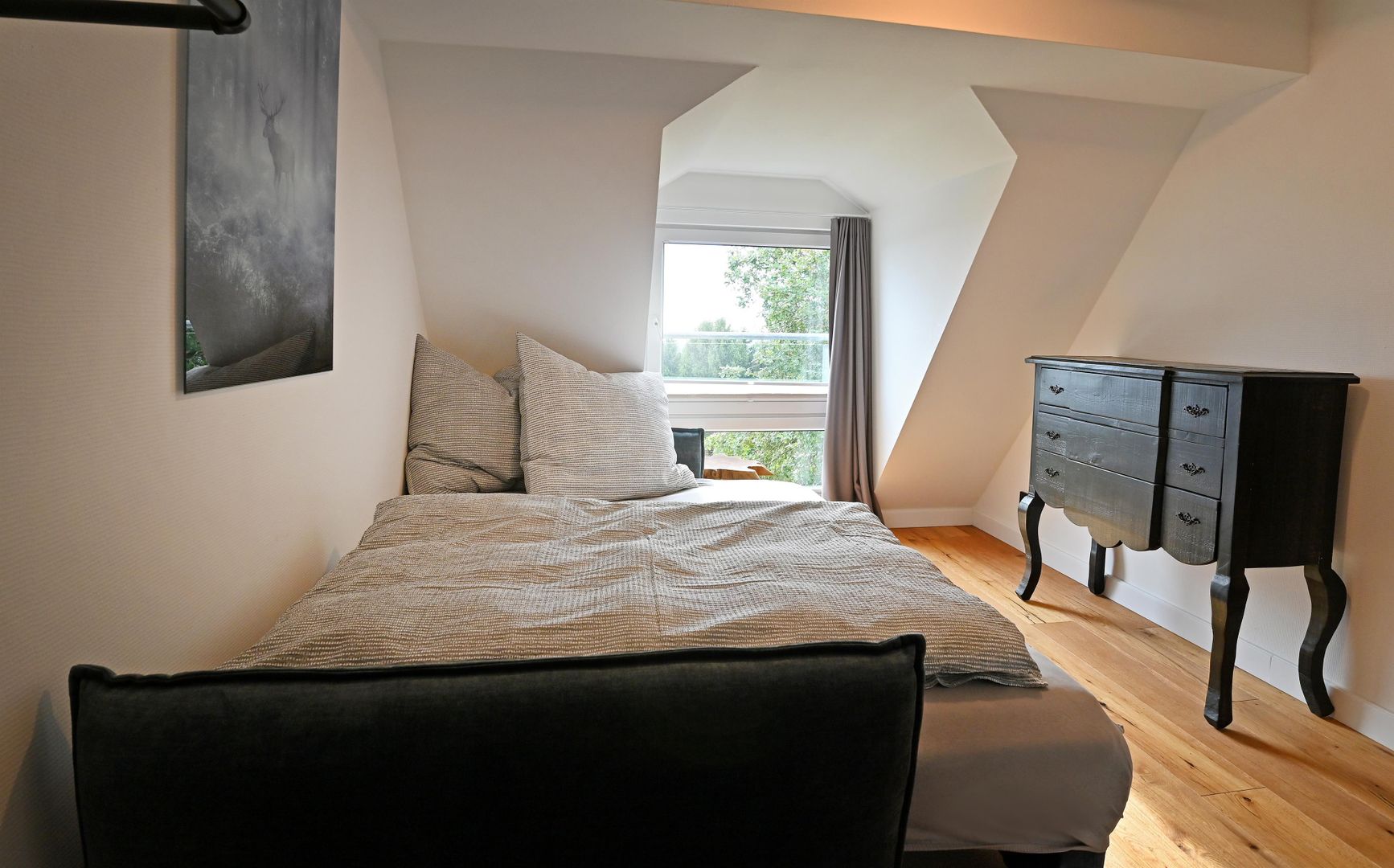 The modern kitchen invites you to cook extensively, the round dining table offers space for six people and is ideal for communal meals. Real wood floors and real wood doors give the flat a warm atmosphere. Practical amenities such as a washing machine and dryer are also available.