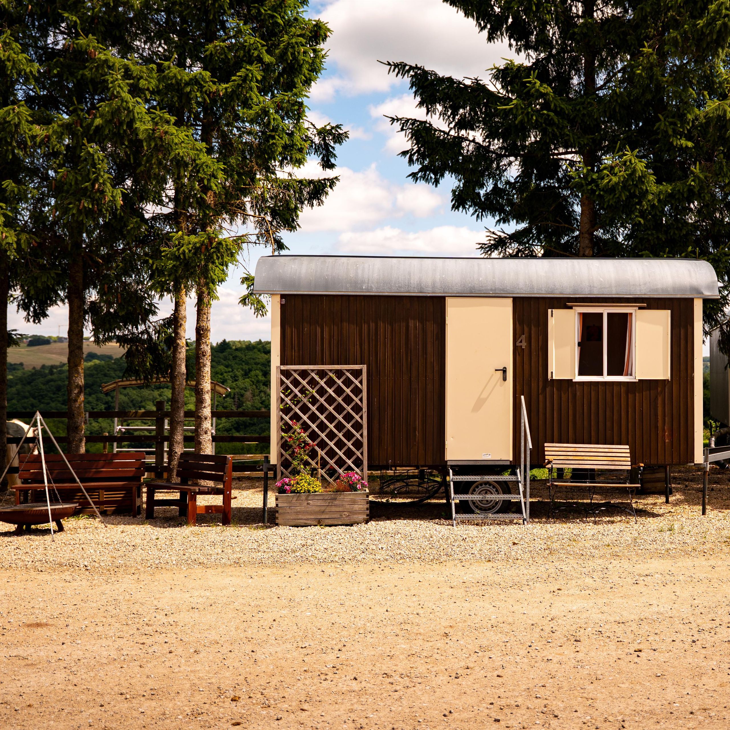 Comfortable, surprisingly charming living and sleeping facilities for 4 people per trailer. In addition to a double bed and a seating area, which can be converted into a second double bed in a few simple steps, there is also a small kitchen. All caravans are equipped with heating. Shower and washing facilities as well as Swedish organic composting toilets are also available.