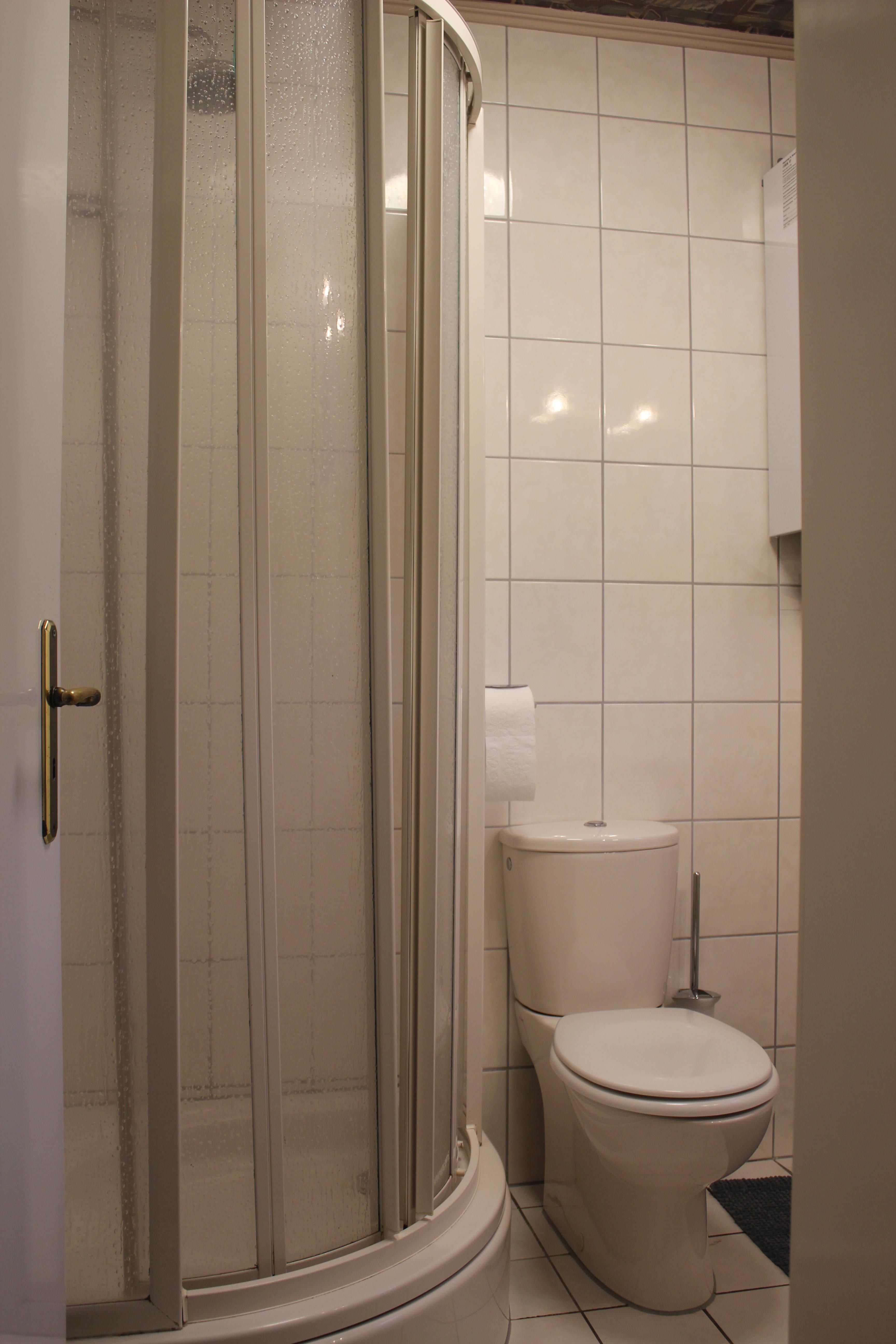 The bathroom on the ground floor has a shower, a sink and a toilet. There is also an additional toilet on the ground floor.