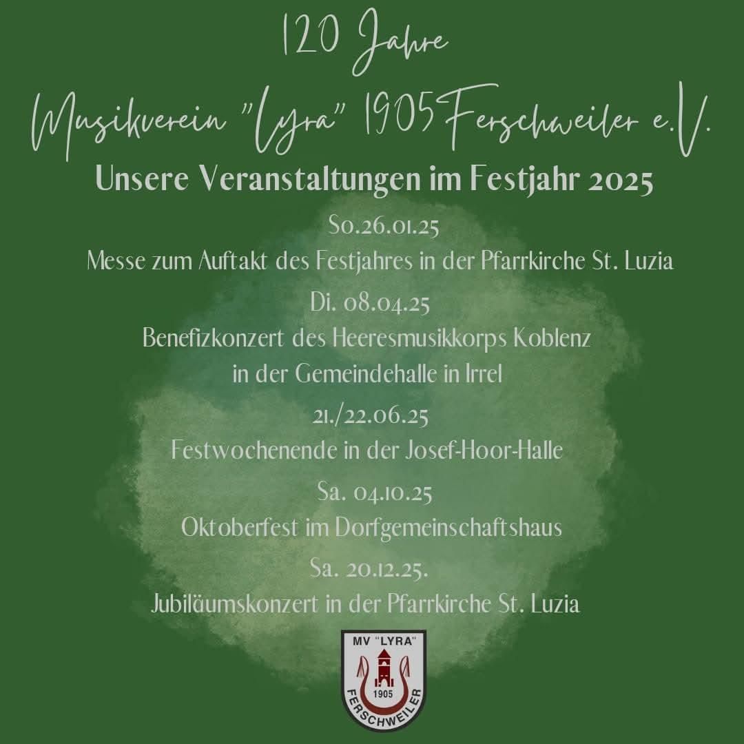 Der Musikverein "Lyra" 1905 Ferschweiler e.V. feiert 120-jähriges Jubiläum und lädt dazu zu tollen Veranstaltungen ein.