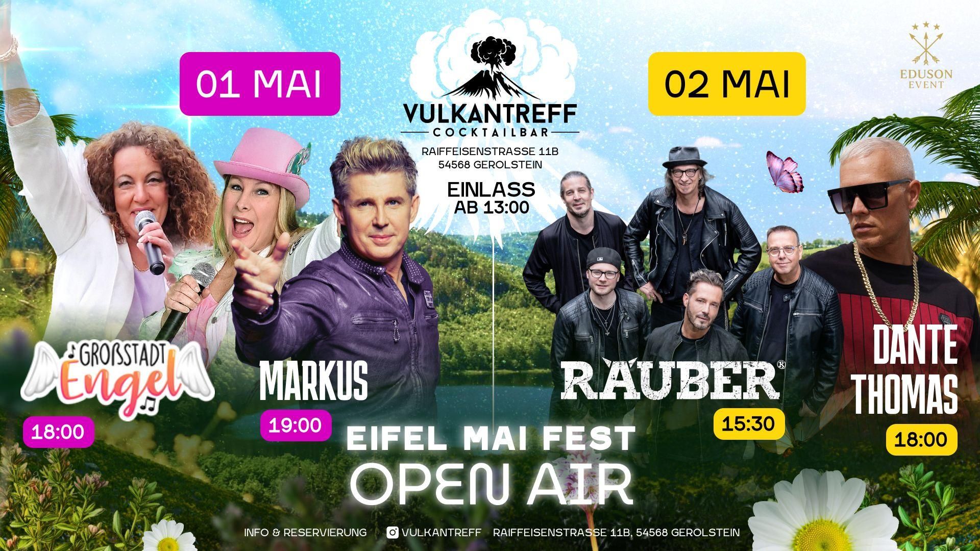 Freut euch auf ein unvergessliches 3-tägiges Mai-Festival in der Eifel im Vulkantreff Cocktailbar!Vom 01. Mai bis 03. Mai erwartet euch ein abwechslungsreiches Programm mit Live-Musik, Party und einem großen Kinderfest unter freiem Himmel. 01. MAI – LIVE MUSIK: 18:00 Uhr – Großstadt Engel, 19:00 Uhr – Markus; 02. MAI – PARTY & KONZERT: 15:30 Uhr – Räuber, 18:00 Uhr – Dante Thomas; 03. MAI – WUNDERLAND KINDERFEST: Ein großer Familientag mit vielen Attraktionen für Kinder: Riesige Hüpfburgen Magische Konfetti-Show Treffen mit beliebten Figuren wie Panda, Stitch, Labubu & mehrOrt: Raiffeisenstraße 11B, 54568 Gerolstein Einlass: ab 13:00 Uhr