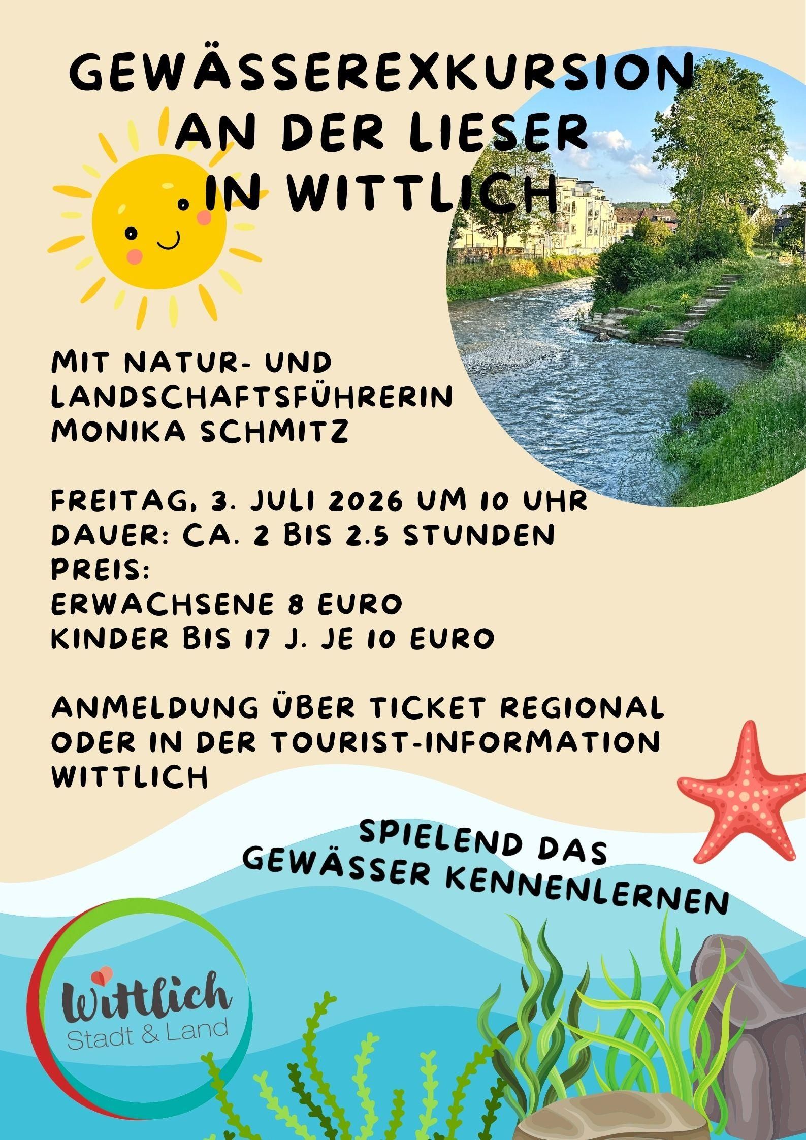 Sommerferienspaß mit der Natur- und Landschaftsführerin Monika Schmitz an und in der Lieser in Wittlich. Ausgestattet mit Mehlsieb und/oder Kescher starten wir in das rund 2,5stündige Lieser-Erkundungsabenteuer. Dabei entdecken wir große und kleine "Flussbewohner", fischen steinerne Schätze aus dem Wasser, lösen knifflige Rätsel und lernen spielerisch warum Flüsse wichtig und schützenswert sind.