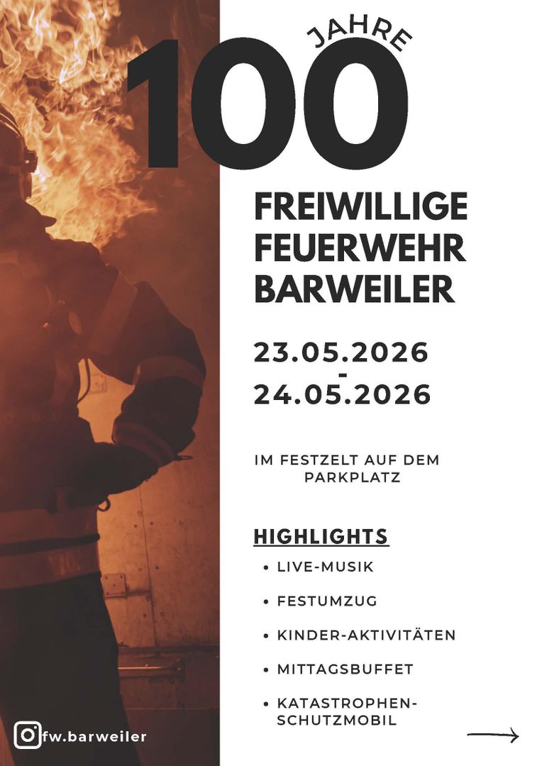 Die Freiwillige Feuerwehr Barweiler feiert ein ganz besonderes Jubiläum: Seit 100 Jahren steht der Löschzug im Dienst der Sicherheit, Hilfe und Kameradschaft in der Gemeinde. Dieses historische Ereignis wird mit einem abwechslungsreichen Festwochenende gebührend gefeiert -