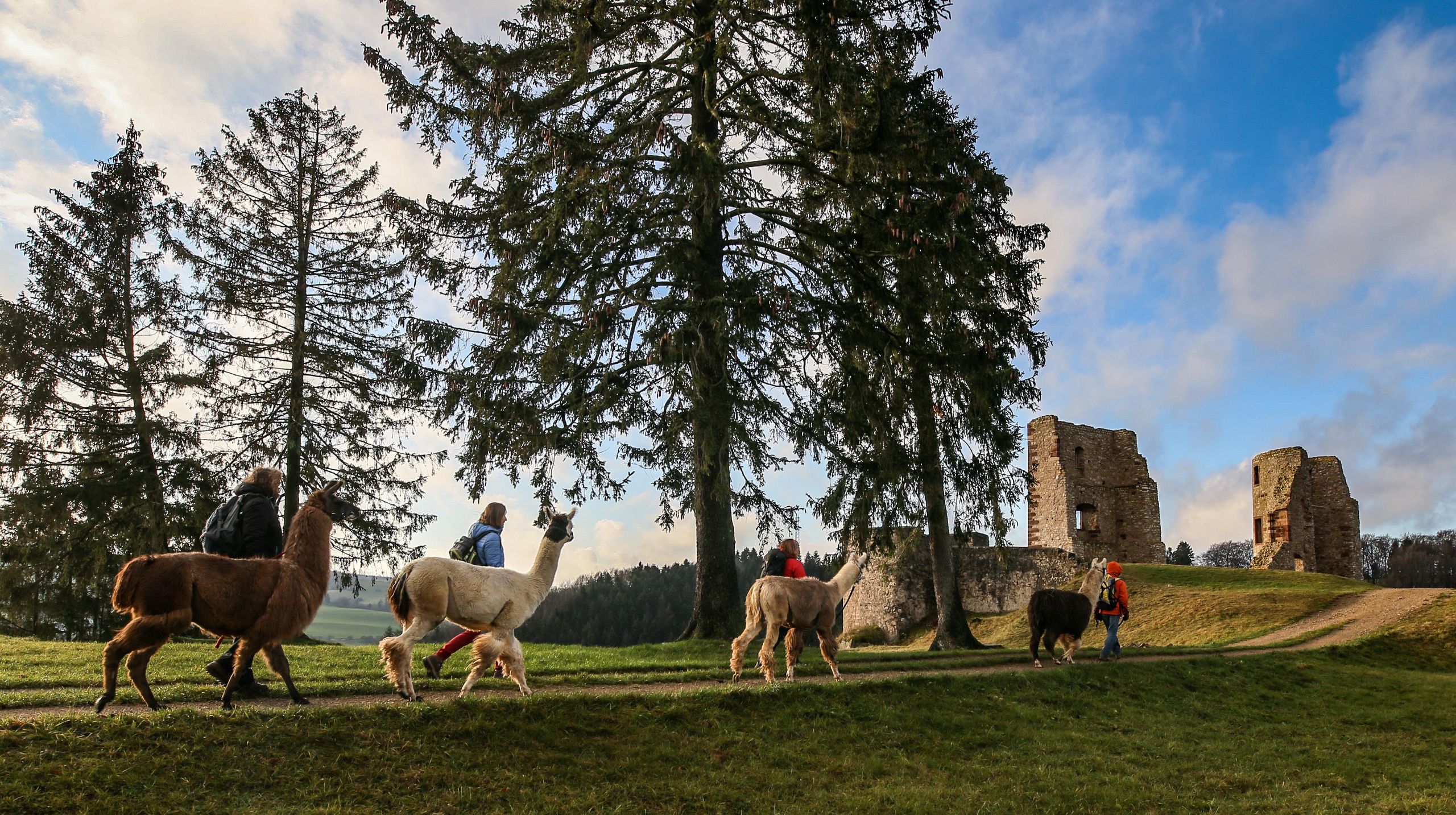 Gleich zu Beginn wandern wir hinab in das Tal des Altburgbachs. Streuobstwiesen und die schlanken Silhouetten der Wacholderbüsche begleiten uns. Dann erklimmen wir den Bergrücken "Op Ischt" und genießen die weiten Ausblicke auf der Hochebene. Später tauchen wir in den Buchenwald ein und gelangen an eine versteckte Lichtung, in der wir eine erste Pause einlegen. Oberhalb des Schalkenbachs geht es weiter, mitten durch den Wald auf schmalen Pfädchen. Endlich gelangen wir an die uralte Keltenfliehburg, die oberhalb des Altburgbachs auf steilen Felsen thront. Hier legen wir nochmal eine kleine Rast ein und haben auch ausgiebig Zeit, uns mit den Lamas zu fotografieren. Dann gilt es über einen schmalen Pfad vom Felssporn wieder hinunter ins Tal zu kommen. Dem Altburgbach folgend erreichen wir nach etwa vier Stunden wieder unseren Ausgangspunkt.