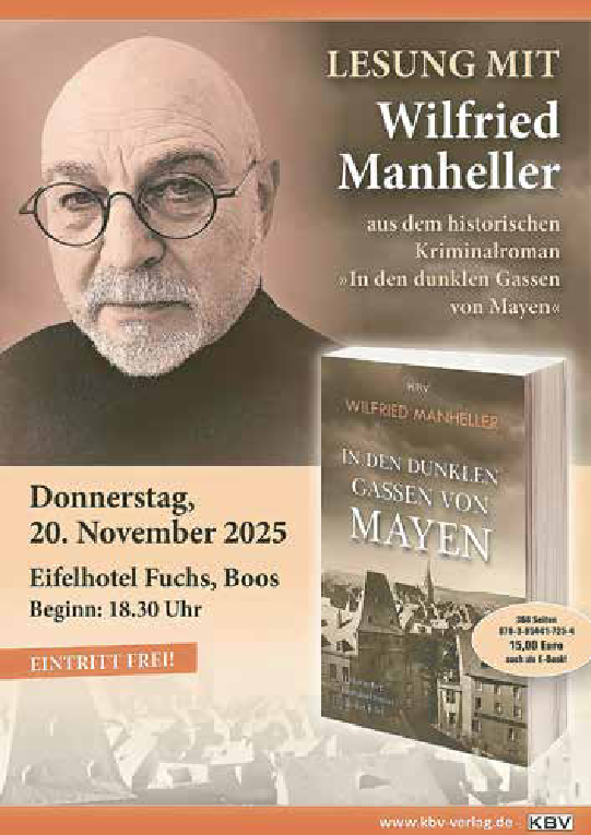 Am Donnerstag den 20. November 2025 findet im Eifelhotel Fuchs in Boos eine Lesung von Wilfried Manheller aus seinem historischen Kriminalroman "In den dunklen Gassen von Mayen" statt.