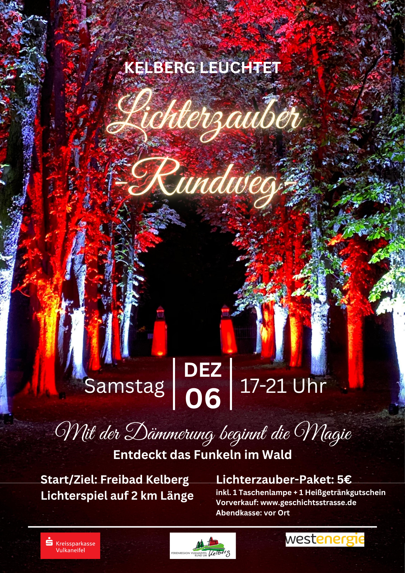 Am Samstag, 6. Dezember 2025, wird Kelberg zum leuchtenden Winterzauber: Von 17:00 bis 21:00 Uhr lädt der erstmals stattfindende „Lichterzauber-Rundweg“ zu einem etwa 2 km langen Abendspaziergang durch die stille, funkelnde Natur ein. Entlang des Weges verwandeln Licht, Farbe und Klang den Wald in eine magische Winterwelt voller Stimmung und überraschender Momente. Jeder Schritt eröffnet neue Eindrücke und lässt den Alltag für einen Moment vergessen.