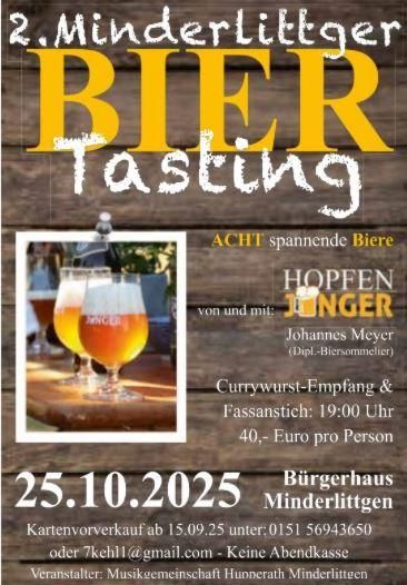 Am 25. Oktober 2025 lädt die Musikgemeinschaft Hupperath Minderlittgen zum Bier Tasting in die Bürgerhaus Minderlittgen ein.