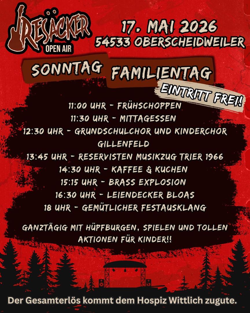 Das Resäcker Open Air ist ein Benefiz Open Air, das seit 2022 auf dem Resäcker Gelände in Oberscheidweiler stattfindet. Der musikalische Fokus liegt auf handgemachter Musik aus verschiedenen Genres. Neben überregional bekannten Künstler versorgen euch regionale Vollblut-Musiker mit beeindruckender Live-Musik.