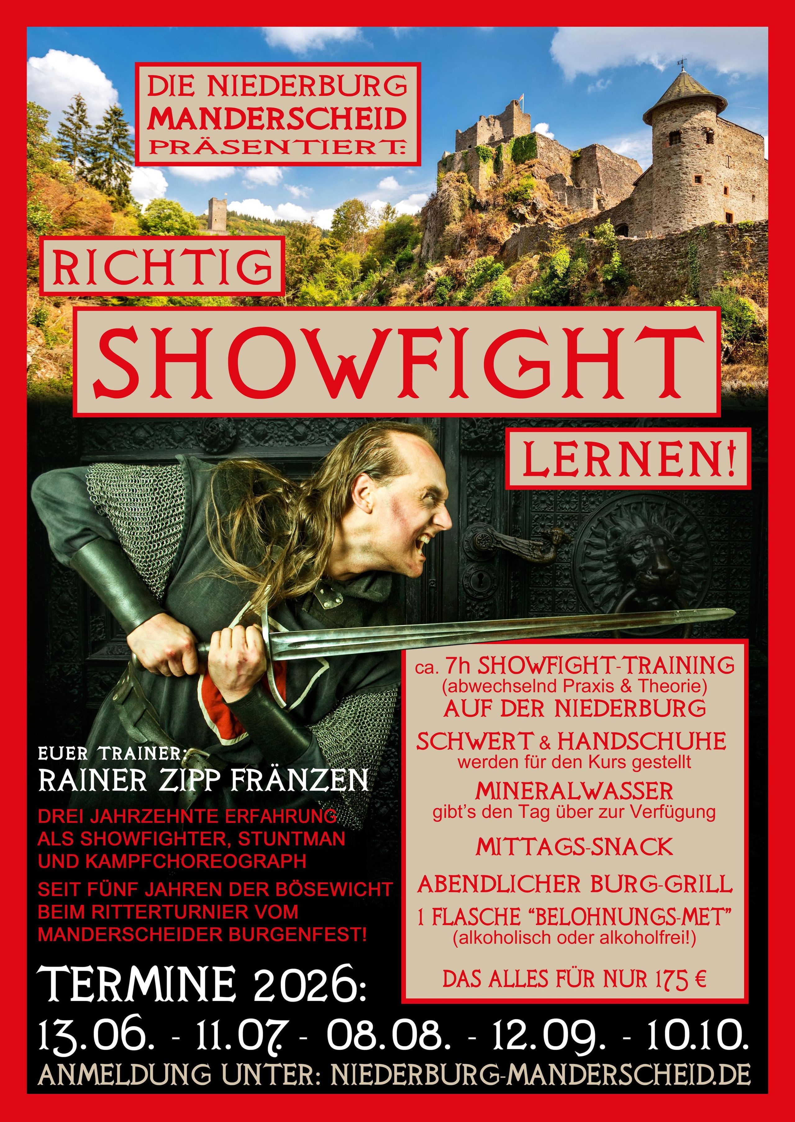 Geleitet werden beide Angebote von Rainer ZIPP Fränzen, einem erfahrenen Showfighter, Stuntman und Kampfchoreografen mit jahrzehntelanger Erfahrung im Bühnen‑ und Filmkampf. Rainer versteht es, sein Wissen verständlich, unterhaltsam und praxisnah zu vermitteln. Seit vielen Jahren ist er außerdem ein fester Bestandteil des Manderscheider Burgenfestes und prägt dort als Bösewicht die Geschichte der actionreichen Ritterturniere. Die einzigartige Verbindung aus professionellem Training, historischer Atmosphäre und herzlicher Gastfreundschaft macht diesen Kurs zu einem unvergesslichen Erlebnis.