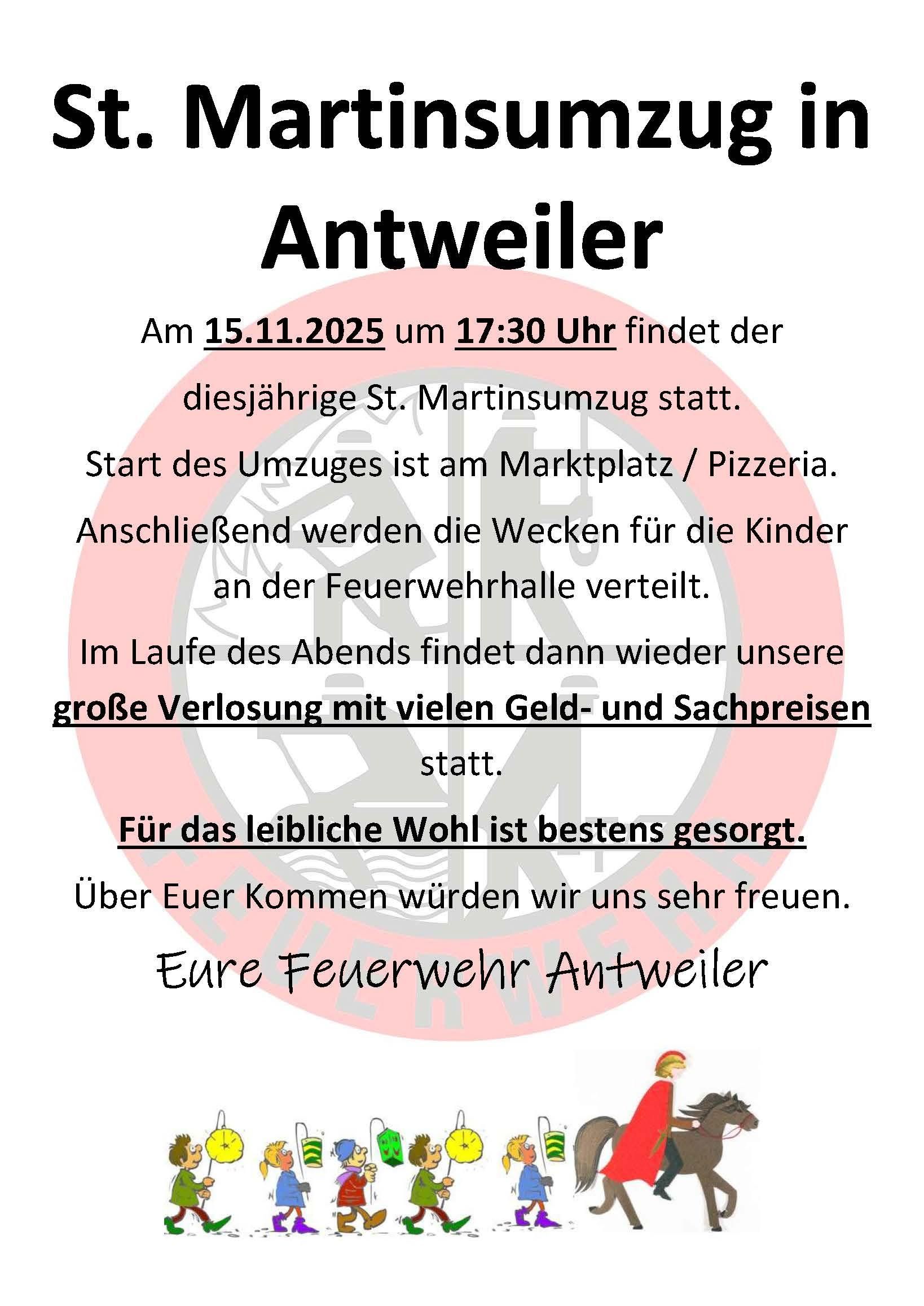 Die Feuerwehr Antweiler lädt herzlich zum traditionellen St. Martinsumzug ein. Treffpunkt ist um 17:30 Uhr am Marktplatz bei der Pizzeria, wo sich Groß und Klein versammeln, um gemeinsam mit bunten Laternen durch das festlich beleuchtete Dorf zu ziehen.