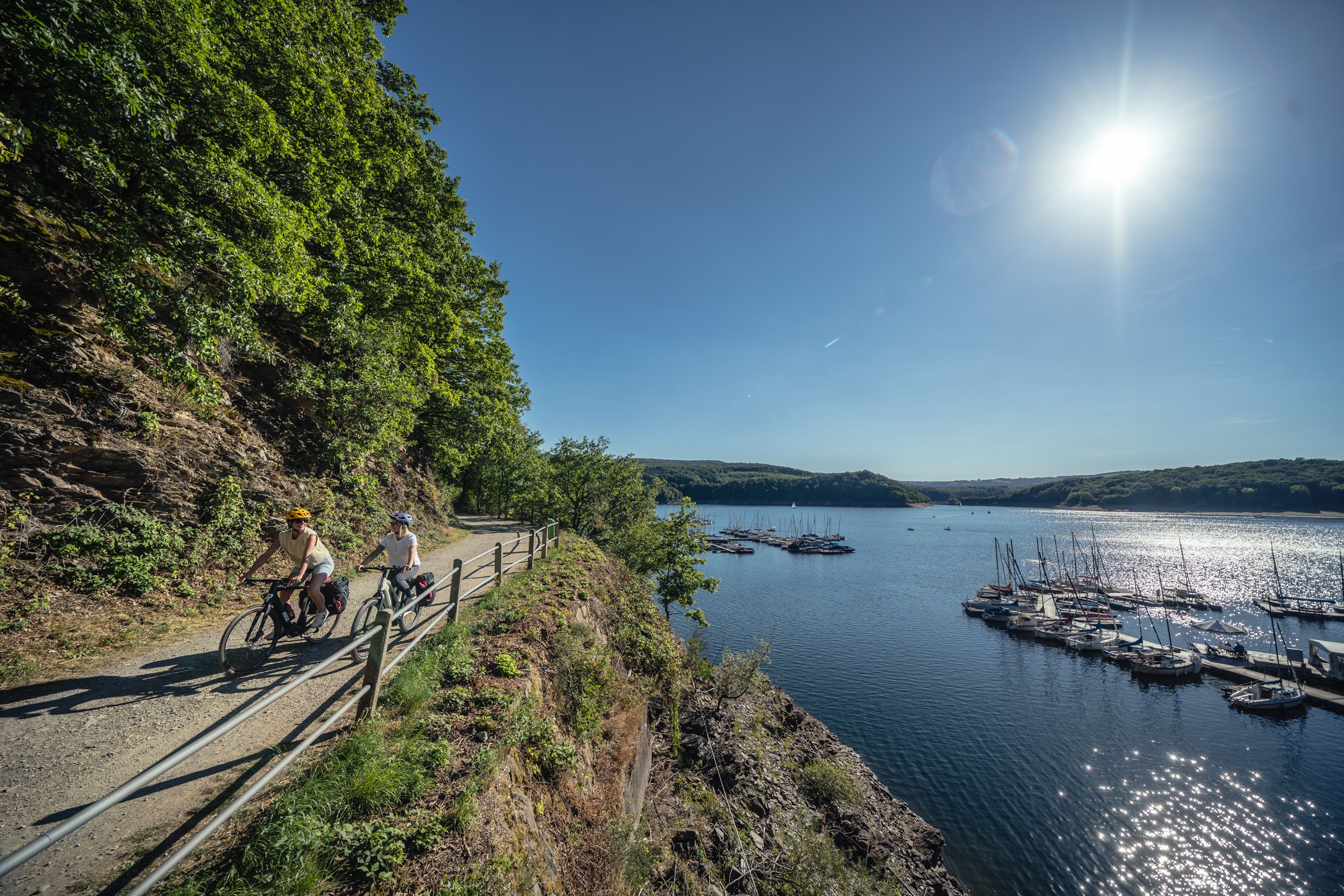 La nature a également beaucoup à raconter ici : Le parc national de l'Eifel par exemple, où la nature peut se développer librement, le bassin de retenue d'Obermaubach et le lac de la Roer, où l'eau scintille sous le soleil et où les pensées peuvent s'écouler librement lors d'une pause.Les liens entre les pays se révèlent au cours du tour, comme entre les voies ferrées désaffectées de Monschau à St. Vith en Belgique et jusqu'à Prüm. Dans la vallée de la Prüm, près de Holsthum, certains se frotteront peut-être les yeux : ici, le houblon pousse en hauteur - un superbe motif pour des photos de vacances inhabituelles.