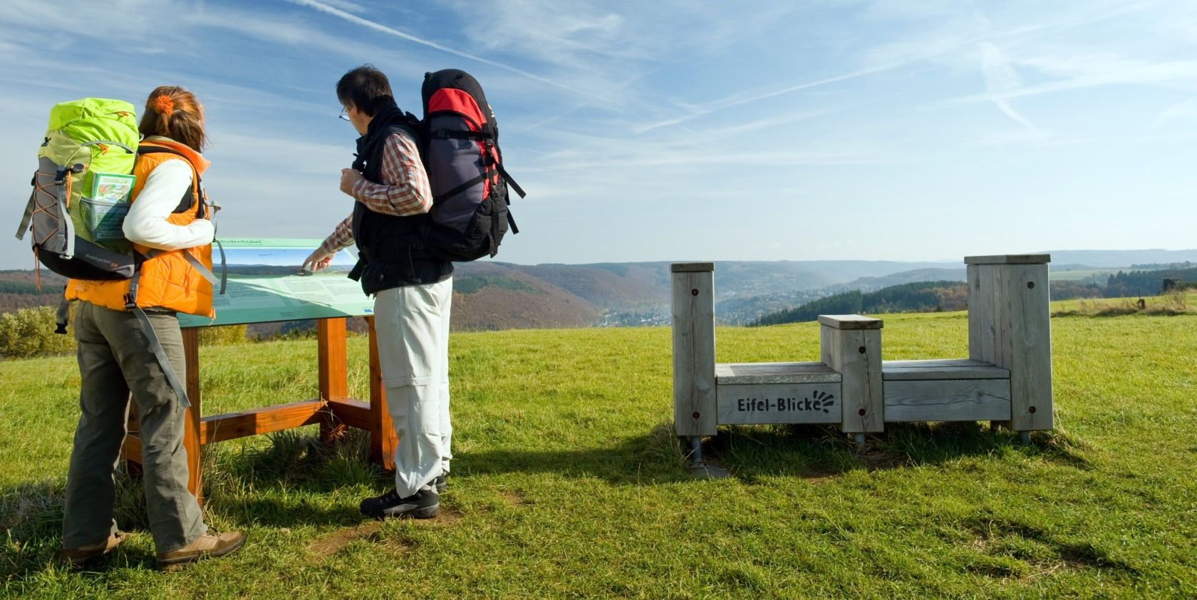 Point de vue avec refuge et vue magnifique sur l'Olef.Des sentiers sinueux mènent à travers la forêt de la vallée de l'Olef jusqu'en haut de la Kuckucksley.