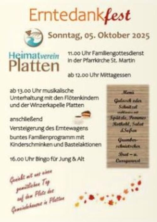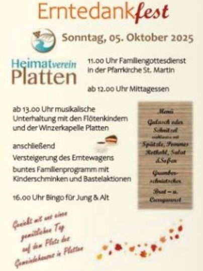 L'association Heimatverein Platten e.V. vous accueille le dimanche 03 octobre 2025 pour la fête des récoltes à Platten.