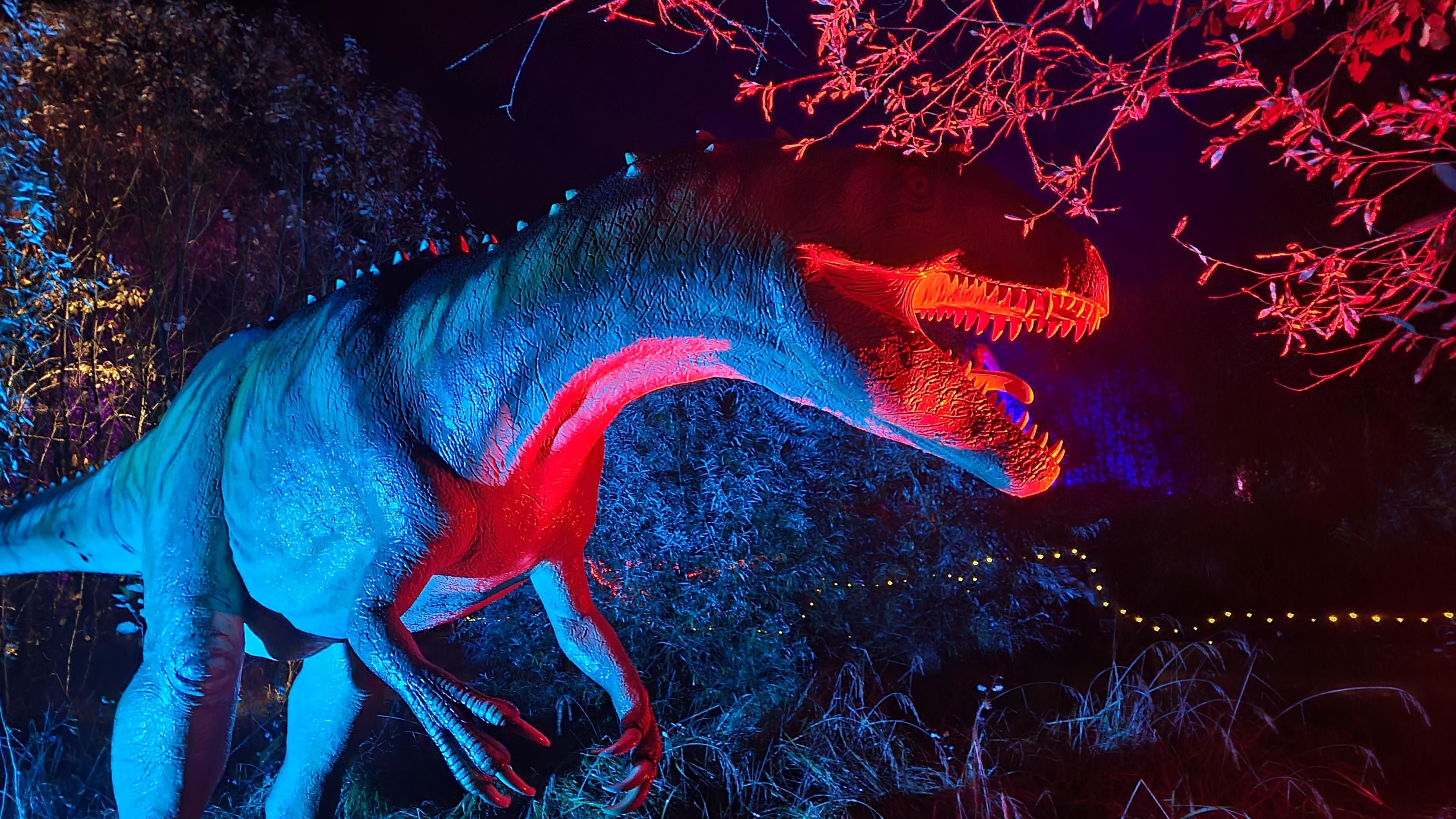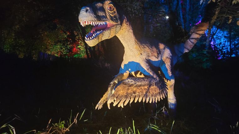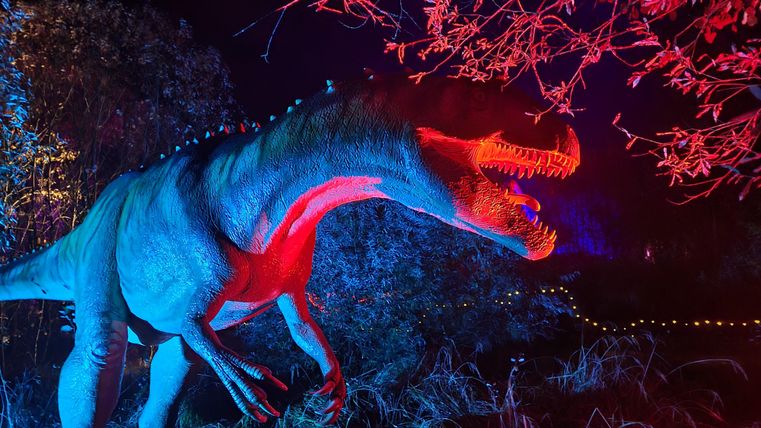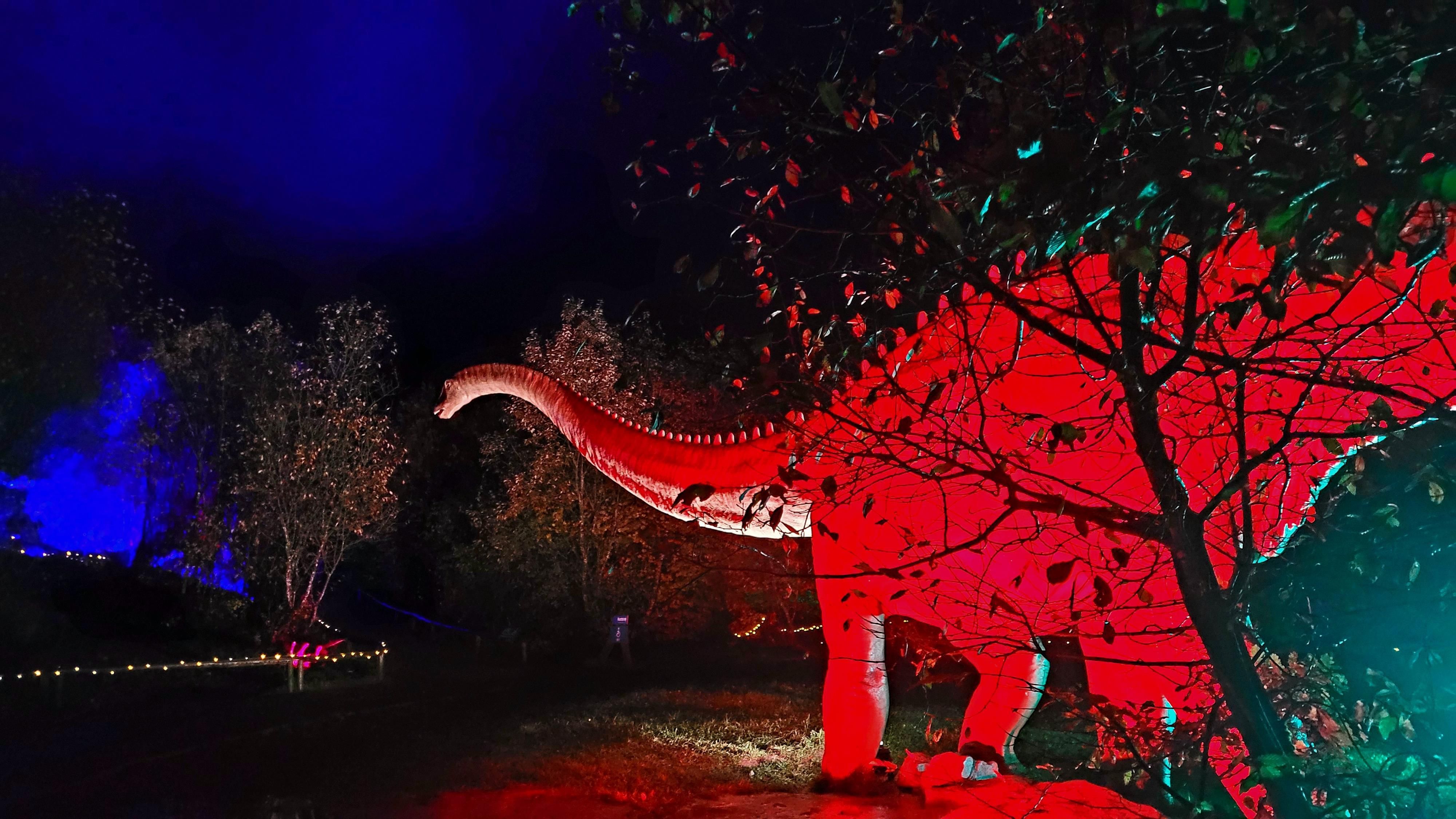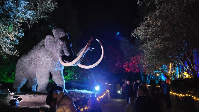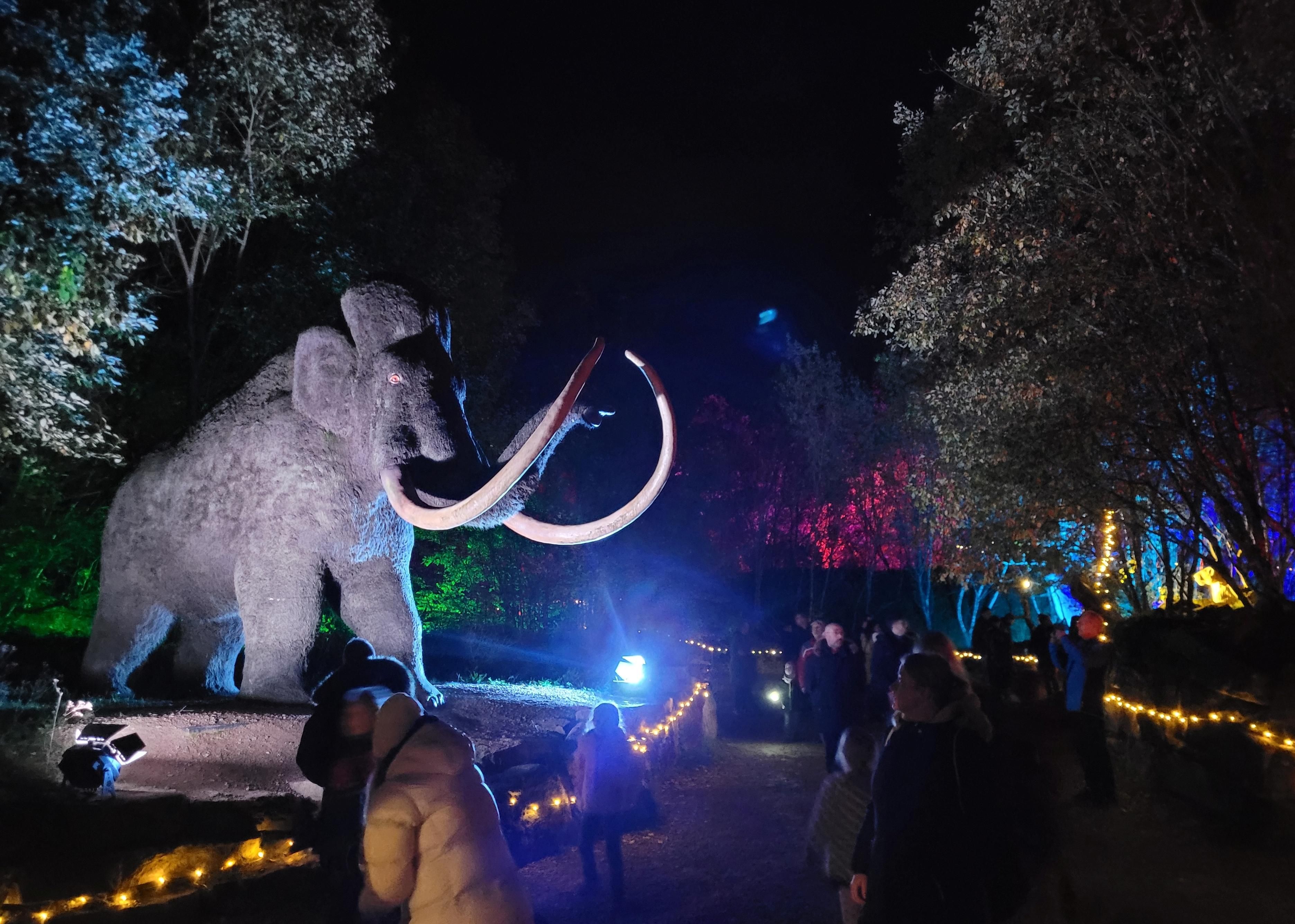 Dans l'obscurité, le parc se transforme en un lieu magique : baignés dans la lumière colorée et mis en scène de manière spectaculaire, des animaux et des scènes de toutes les ères géologiques apparaissent de manière mystérieuse et mystique.