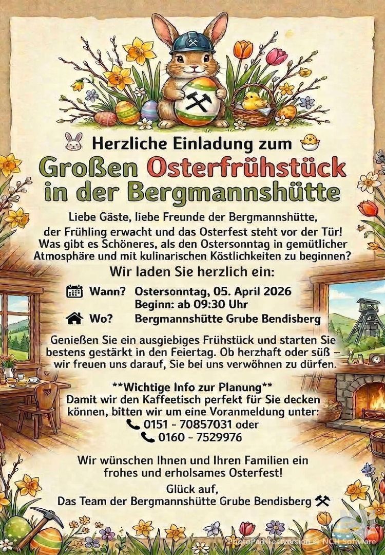 Invitation chaleureuse au grand petit-déjeuner de Pâques dans la hutte des mineurs à la mine de visite de Grube Bendisberg le dimanche de Pâques, 05 avril 2026, à partir de 9h30.