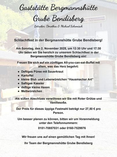 Le dimanche 2 novembre 2025, à 12h30 et 17h30, la cabane des mineurs de la mine touristique de Bendisberg vous invite à sa fête du cochon!