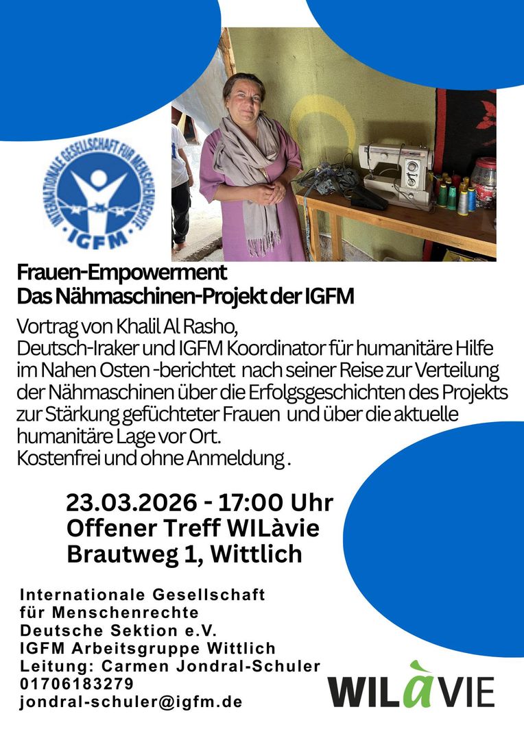 Offre dans WILávie le 23.03.2026, 17h00 "Autonomisation des femmes" Le projet de machines à coudre de l'IGFM