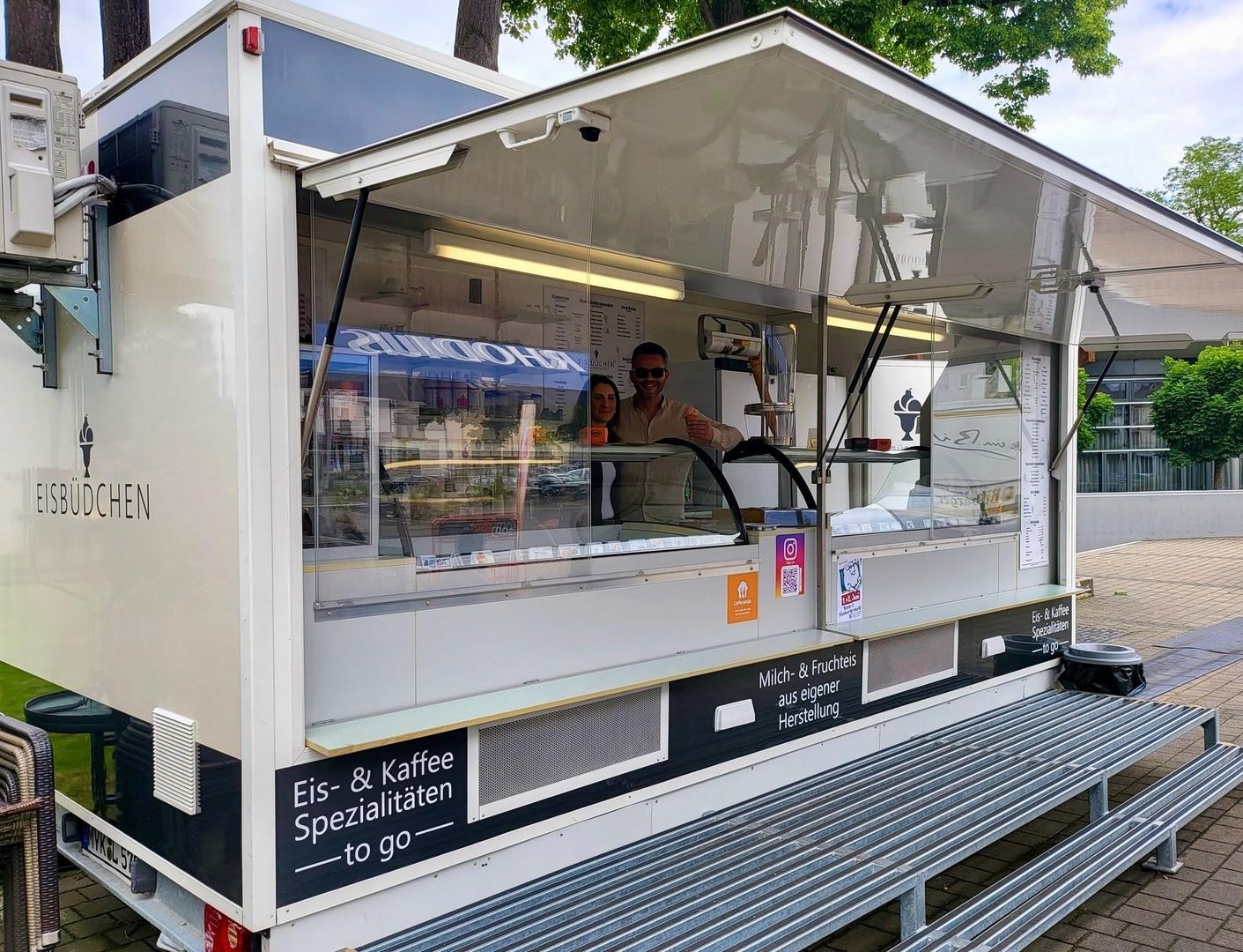 Stand de vente de glaces avec une belle terrasse extérieure. Glaces de notre propre fabrication, boissons, café, mix de lait, également à emporter. Situé à 56637 Plaidt, directement sur la place du village.