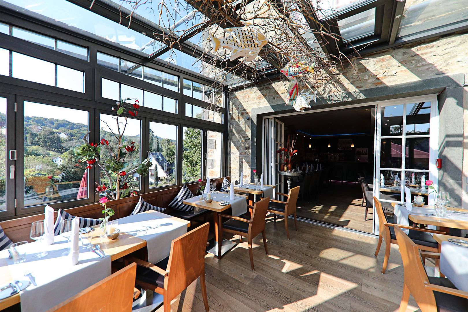 En été, il est temps de profiter de l'air frais : sur la terrasse panoramique, vous pourrez passer un moment agréable à déguster une blonde fraîche et des spécialités juteuses du barbecue. Que ce soit au soleil ou à l'ombre agréable sous notre parasol de près de 100 mètres carrés, chacun trouvera sa place préférée.