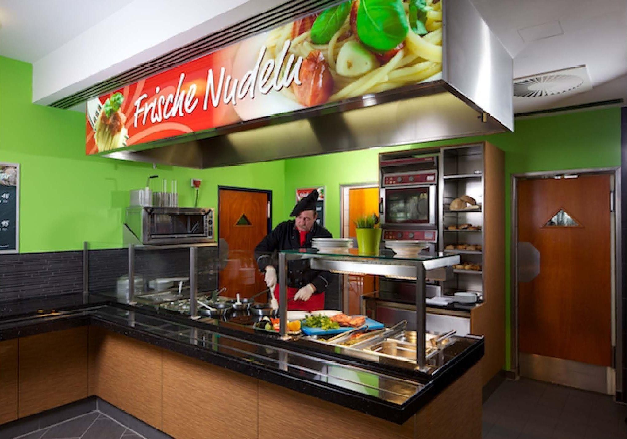 Nos salles climatisées, dotées d'une terrasse extérieure ensoleillée et d'un espace fumeur séparé, offrent une atmosphère détendue dans une architecture moderne. Avec plus de 100 places et un espace self-service parfaitement planifié, le restaurant propose des plats de pâtes et de viande fraîchement préparés au barbecue à la flamme ainsi que des salades croquantes et un vaste buffet de petit-déjeuner.