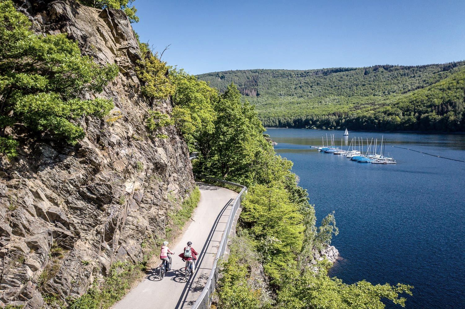 Le point d'information du parc national d'Einruhr se trouve à quelques kilomètres seulement de Rurberg. Vous pouvez y louer des pedelecs pour 35,00 € par jour (une réservation préalable est recommandée au +49 2473 9377 18). Au départ d'Einruhr, le Parc national de l'Eifel ainsi que le lac supérieur peuvent être merveilleusement explorés à pied, à vélo ou à bord des bateaux de la compagnie de navigation Rursee.