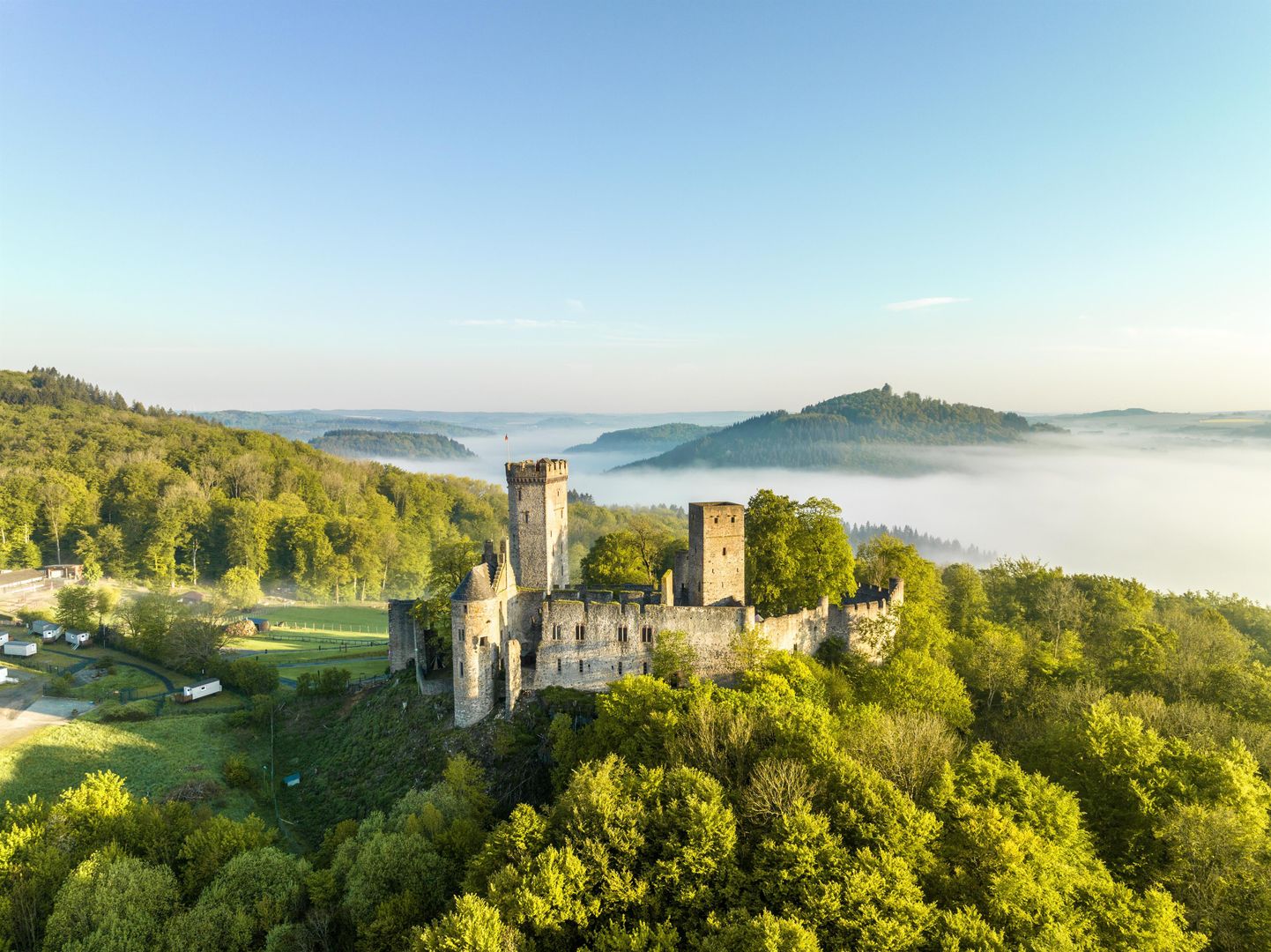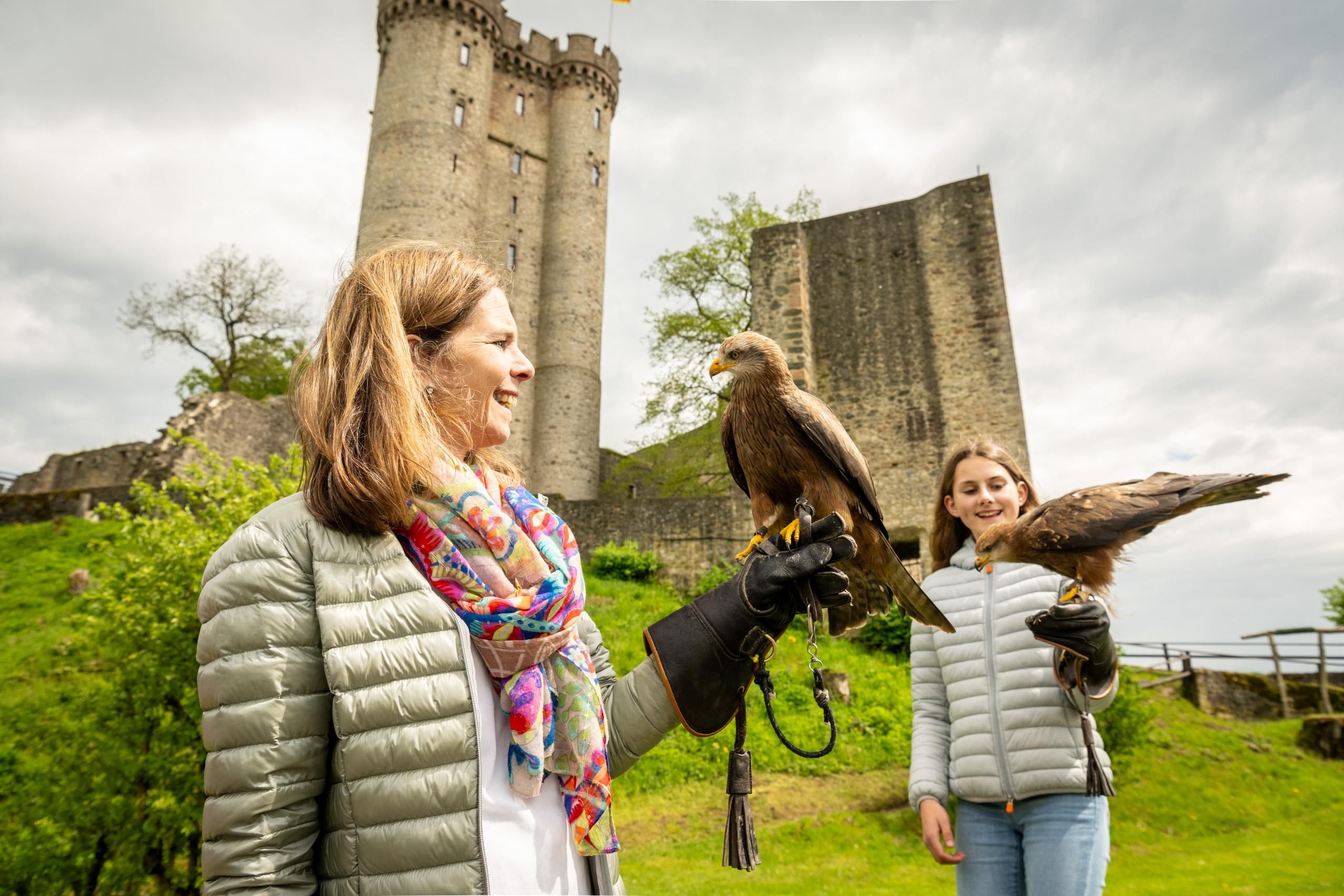 Au-dessus de la rivière Eifel Kyll et sur un massif vertical de dolomites et de basalte trône le château de Kassel. Elle se distingue par une imposante tour double qui fait du château datant du XIIe siècle la marque de fabrique du pays de Gerolstein. La ruine bien conservée ne fait pas que battre le cœur des fans médiévaux, petits et grands, elle renferme également un secret passionnant pour les animaux. En effet, elle abrite le parc des aigles et des loups de Kasselburg, avec de nombreux oiseaux de proie majestueux qui montrent leurs acrobaties aériennes dans des spectacles aériens, et la plus grande meute de loups semi-sauvage d'Europe occidentale, vivant sur dix hectares de forêts et de rochers.