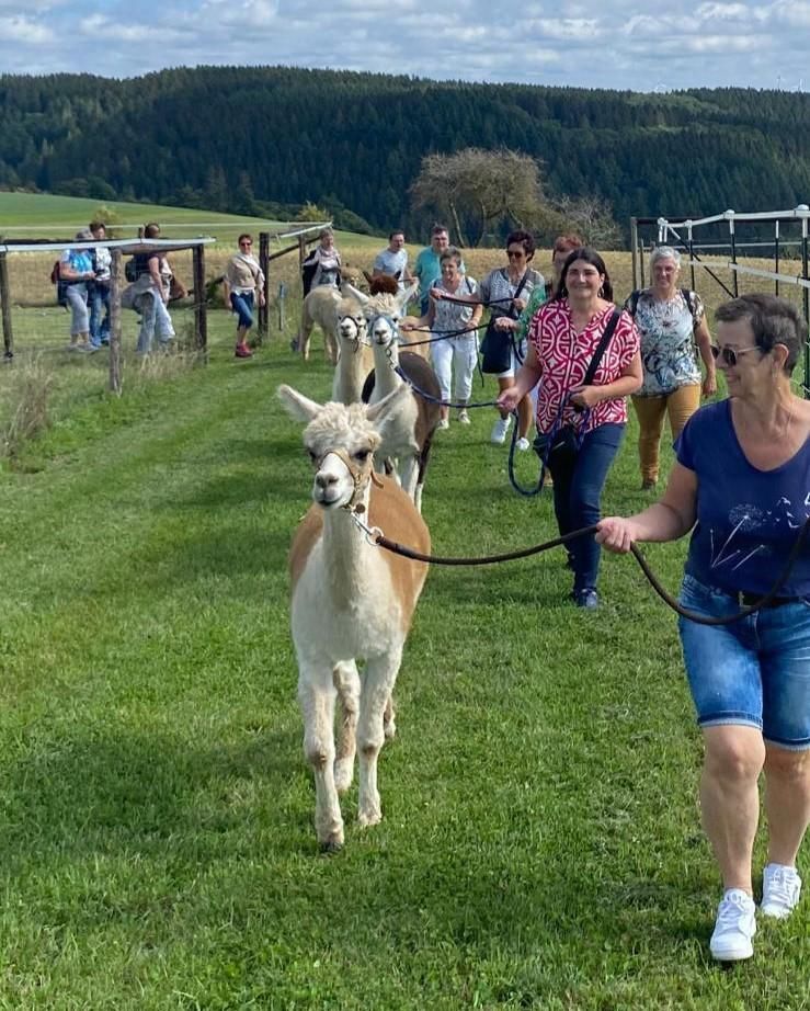 Lors d'une visite de la ferme, vous passez du temps avec les animaux et apprenez des choses intéressantes et utiles sur leur élevage. Vous apprenez de manière ludique, par le contact direct avec Campino et ses congénères, en quoi consiste la fascination de leur métier. Vous pouvez nourrir les alpagas et les photographier. Les animaux seront mis au licol et vous vous promènerez ensemble à travers le magnifique paysage du Haut-Eifel.
