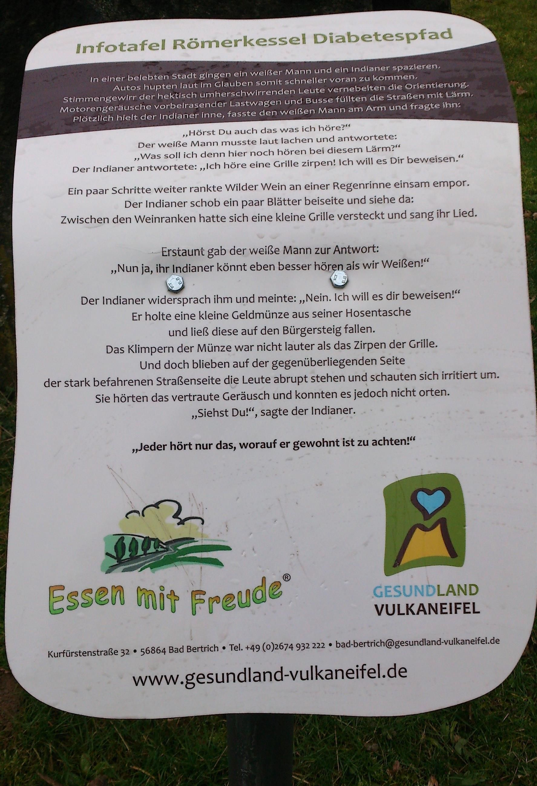 Le diabète : une mauvaise piste pour Bertrich Exercice. Le médicament sans effets secondaires Lisez les panneaux d'information, "comprenez" votre situation métabolique, suivez votre chemin lentement et consciemment et découvrez de nouvelles perspectives. Conseil : demandez un conseil nutritionnel professionnel individuel (contact : Essen mit Freude, Tél. 02674-9139815, www.essen-mit-freude.de).